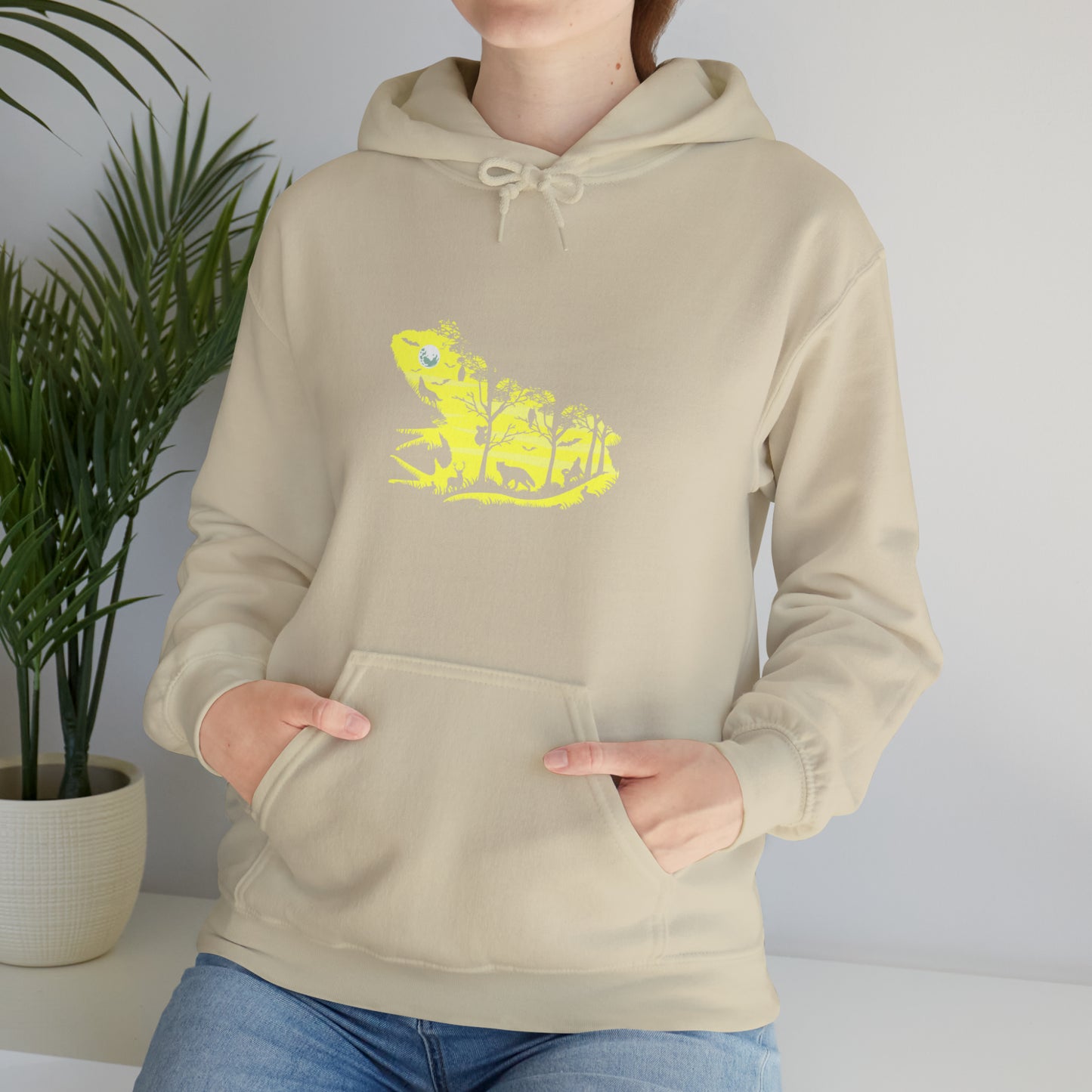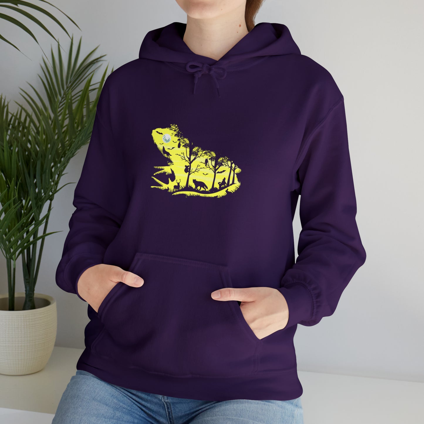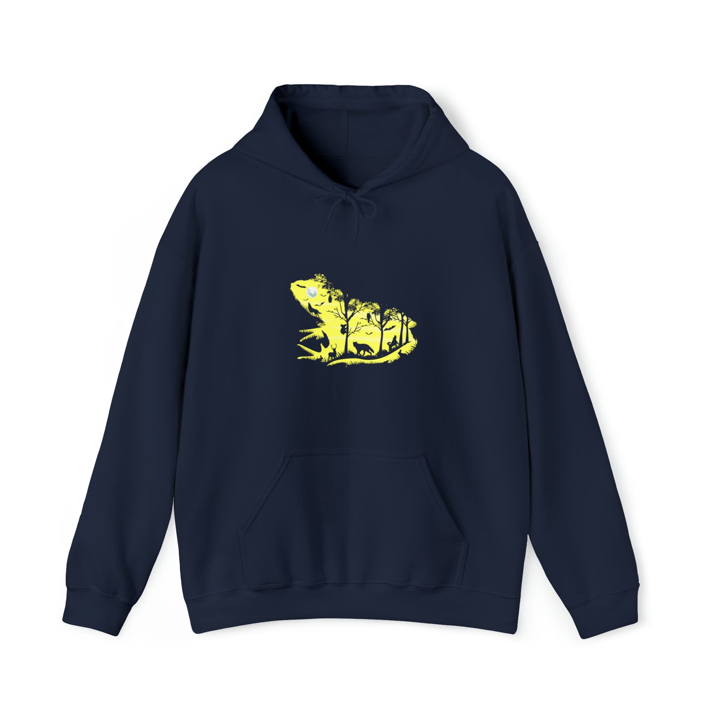 This unisex heavy blend hooded sweatshirt is relaxation itself. Made with a thick blend of cotton and polyester, it feels plush, soft and warm, a perfect choice for any cold day. In the front, the spacious kangaroo pocket adds daily practicality while the hood's drawstring is the same color as the base sweater for extra style points. Chill Stitch – Frog Froggy Night Nature | Abstract | Minimalist | Modern - Unisex Hooded Hoodie Sweatshirt – Embrace Your Vibe