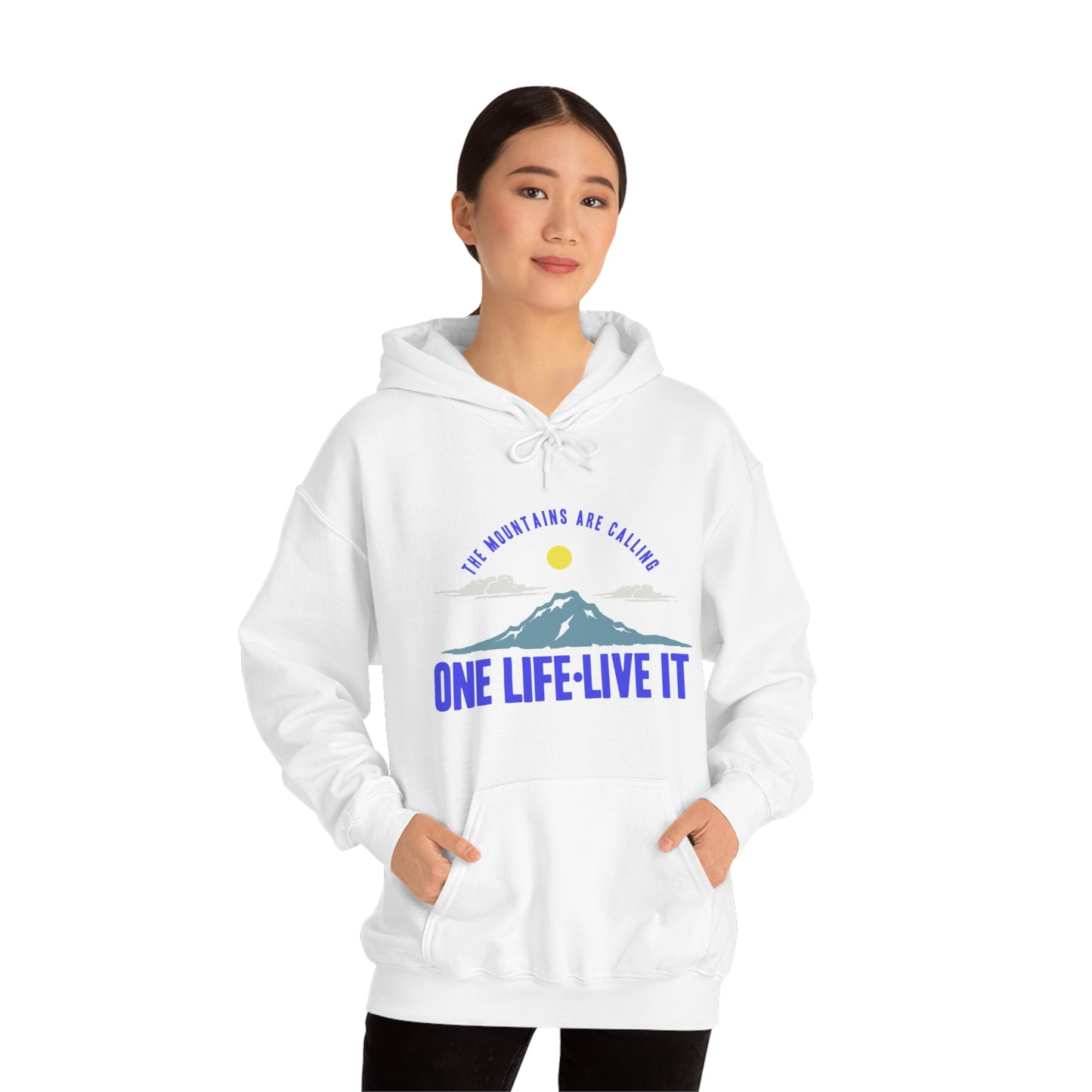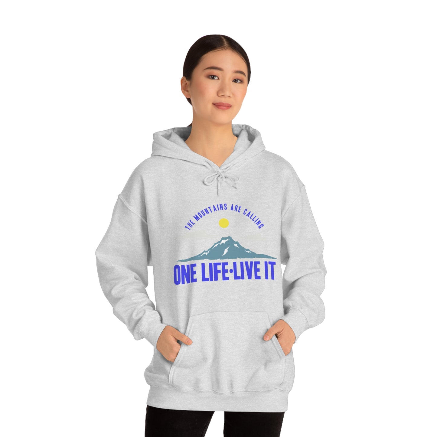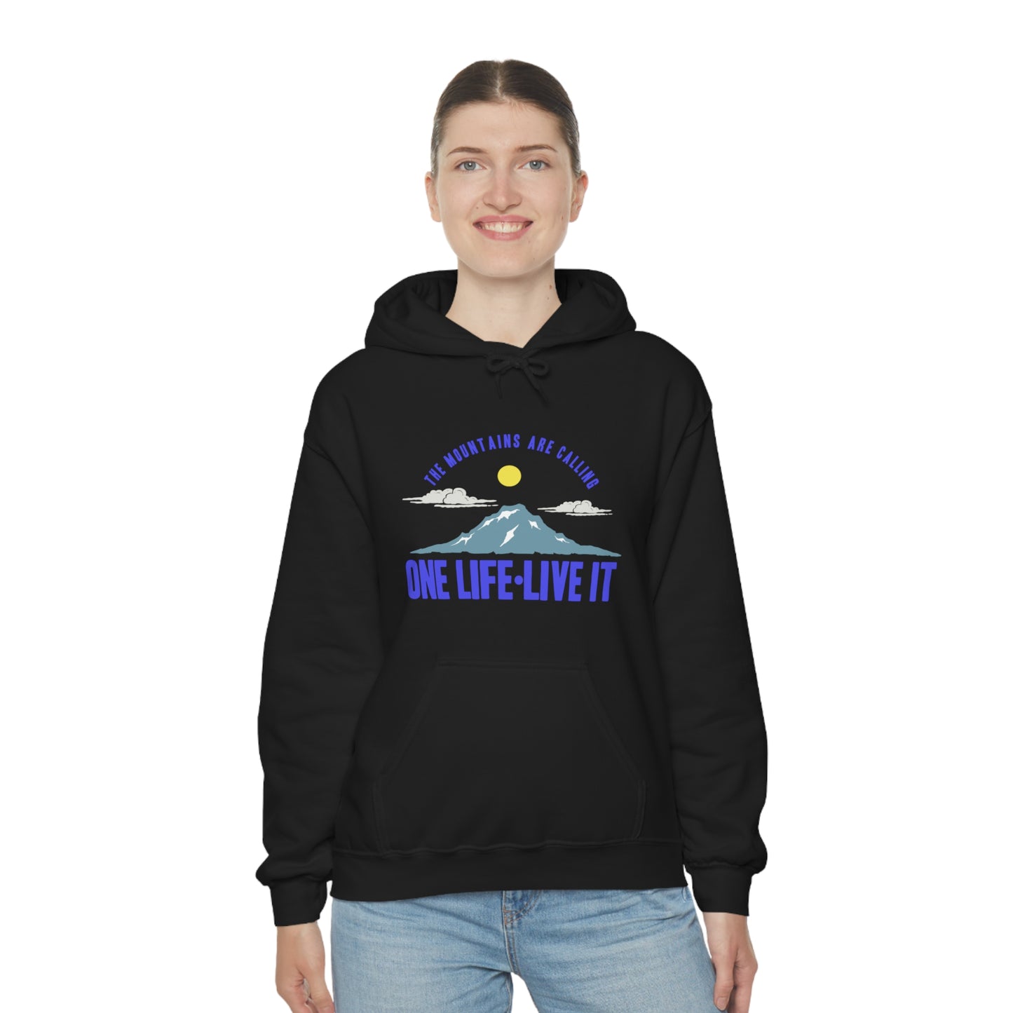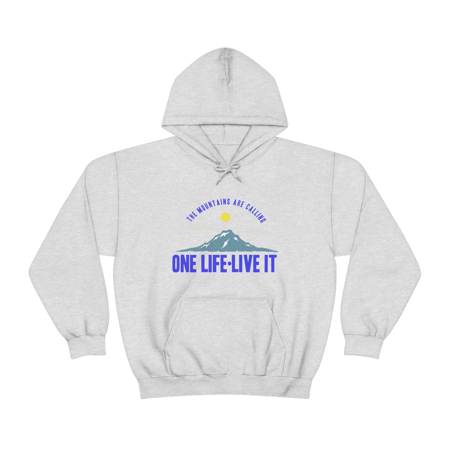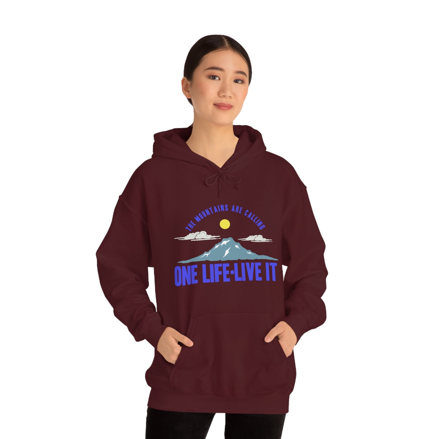 This unisex heavy blend hooded sweatshirt is relaxation itself. Made with a thick blend of cotton and polyester, it feels plush, soft and warm, a perfect choice for any cold day. In the front, the spacious kangaroo pocket adds daily practicality while the hood's drawstring is the same color as the base sweater for extra style points. Chill Stitch – Mountains One Life Live It - Unisex Hooded Hoodie Sweatshirt – Embrace Your Vibe