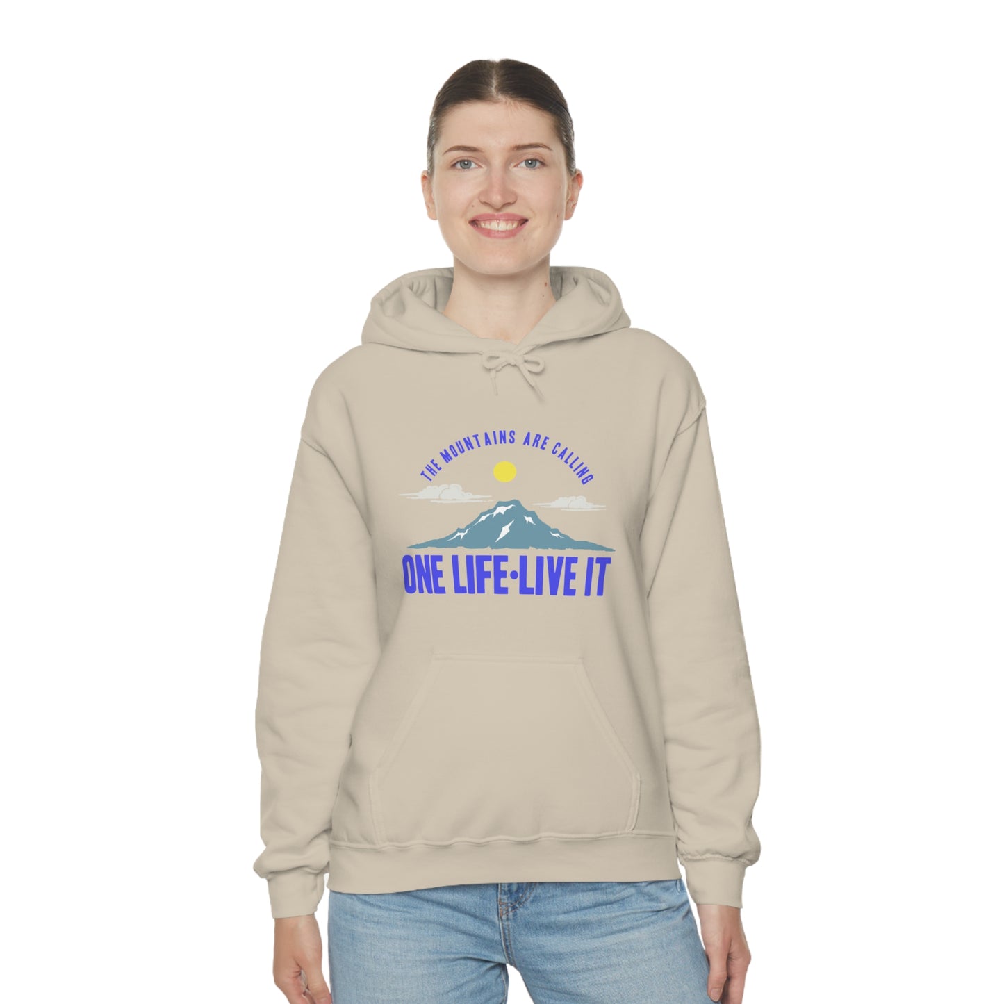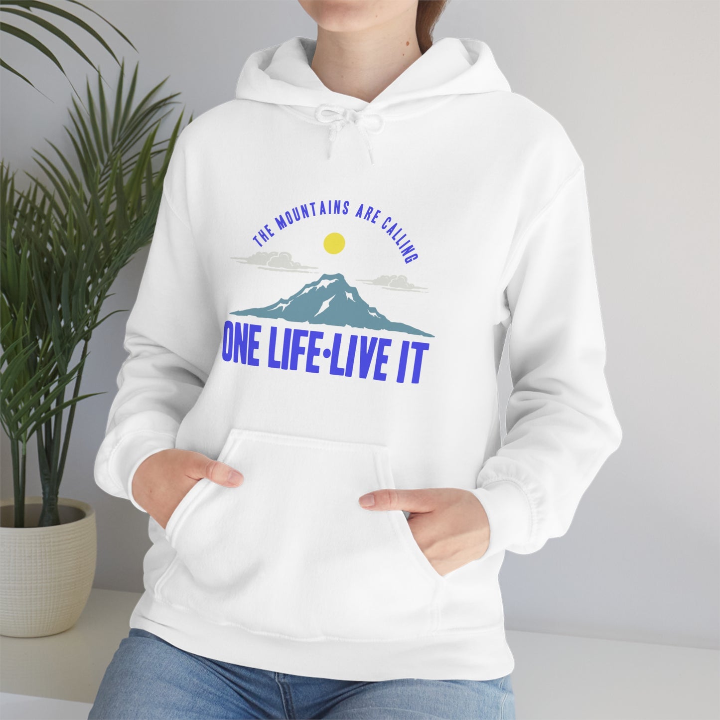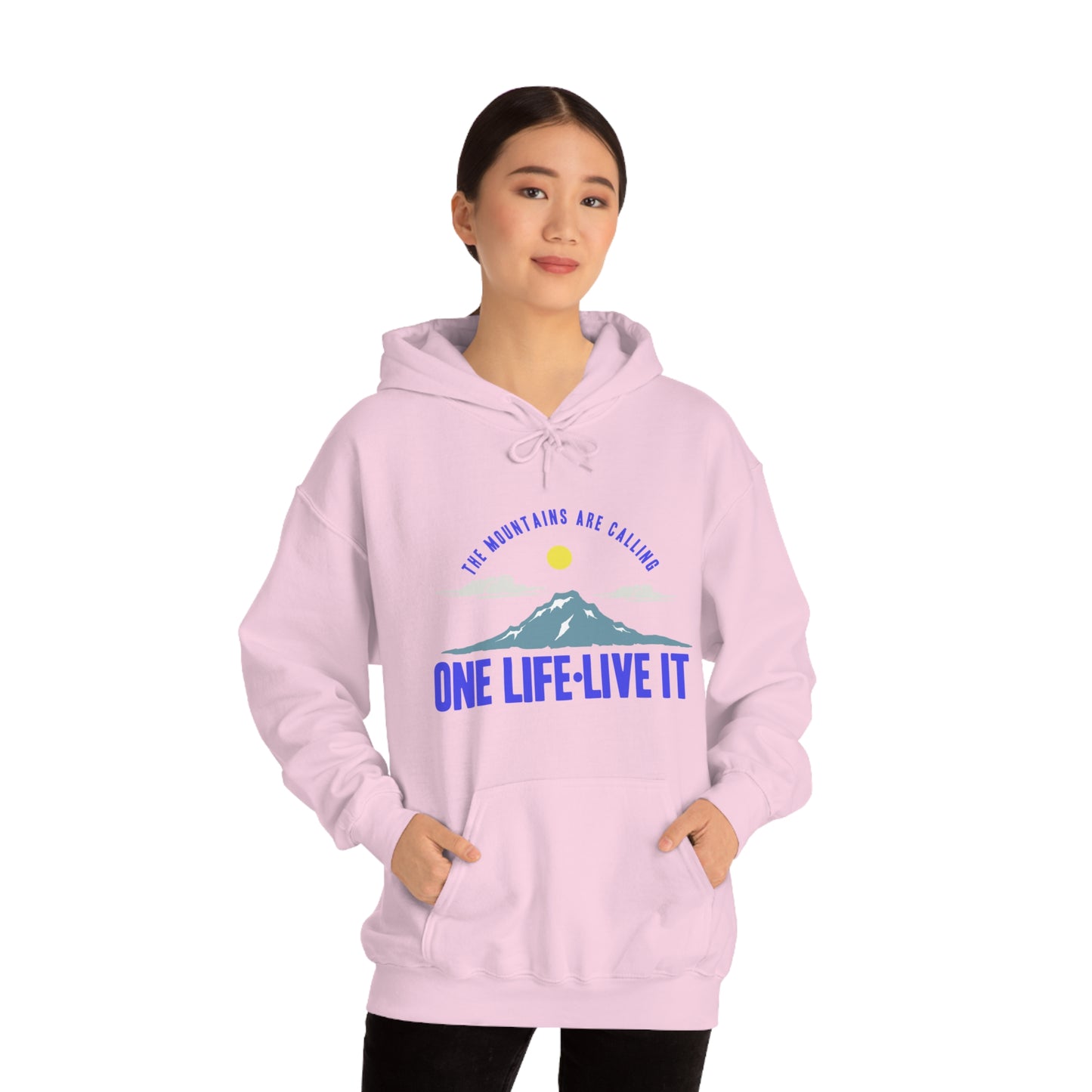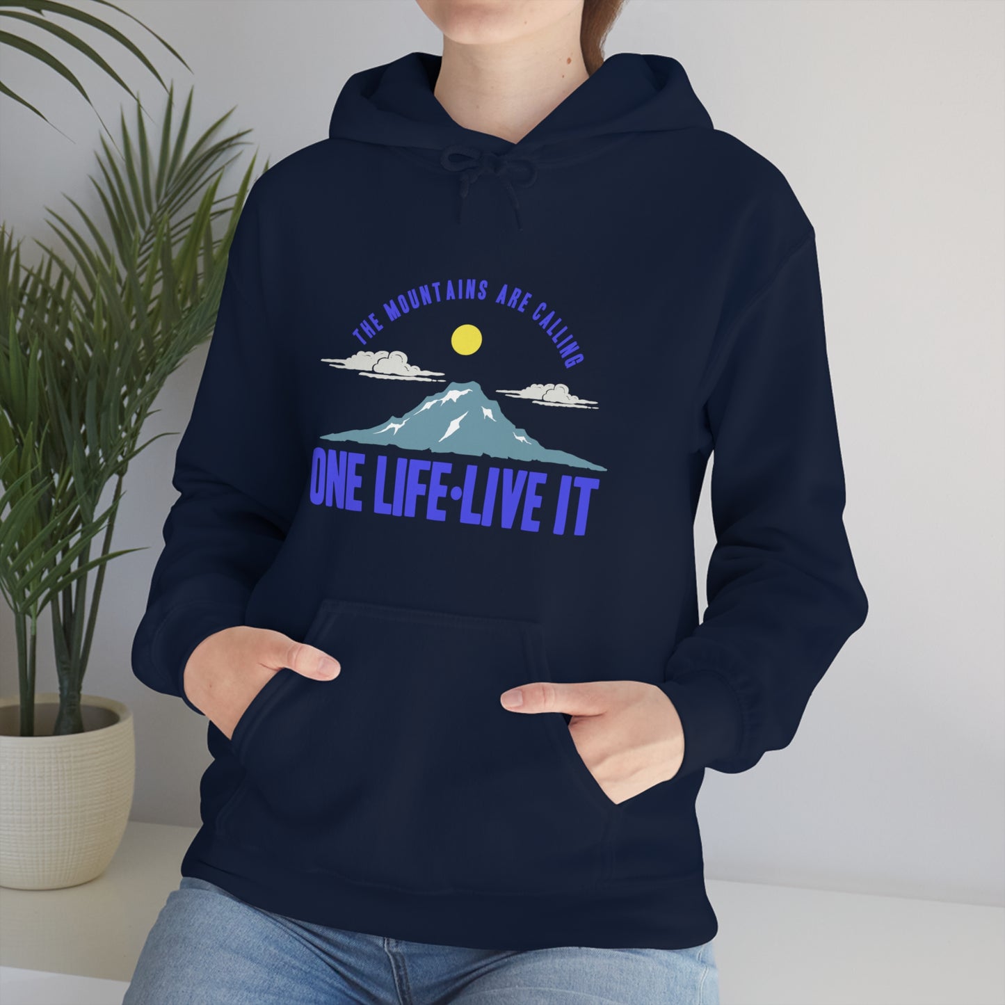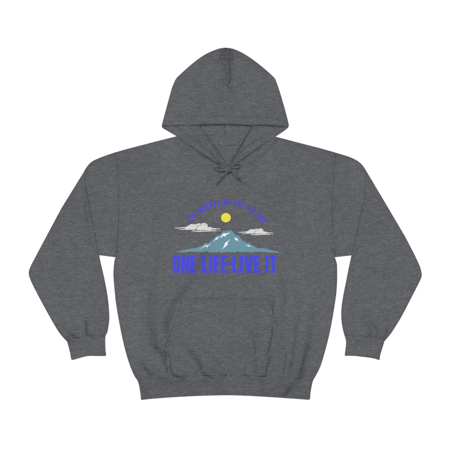 This unisex heavy blend hooded sweatshirt is relaxation itself. Made with a thick blend of cotton and polyester, it feels plush, soft and warm, a perfect choice for any cold day. In the front, the spacious kangaroo pocket adds daily practicality while the hood's drawstring is the same color as the base sweater for extra style points. Chill Stitch – Mountains One Life Live It - Unisex Hooded Hoodie Sweatshirt – Embrace Your Vibe
