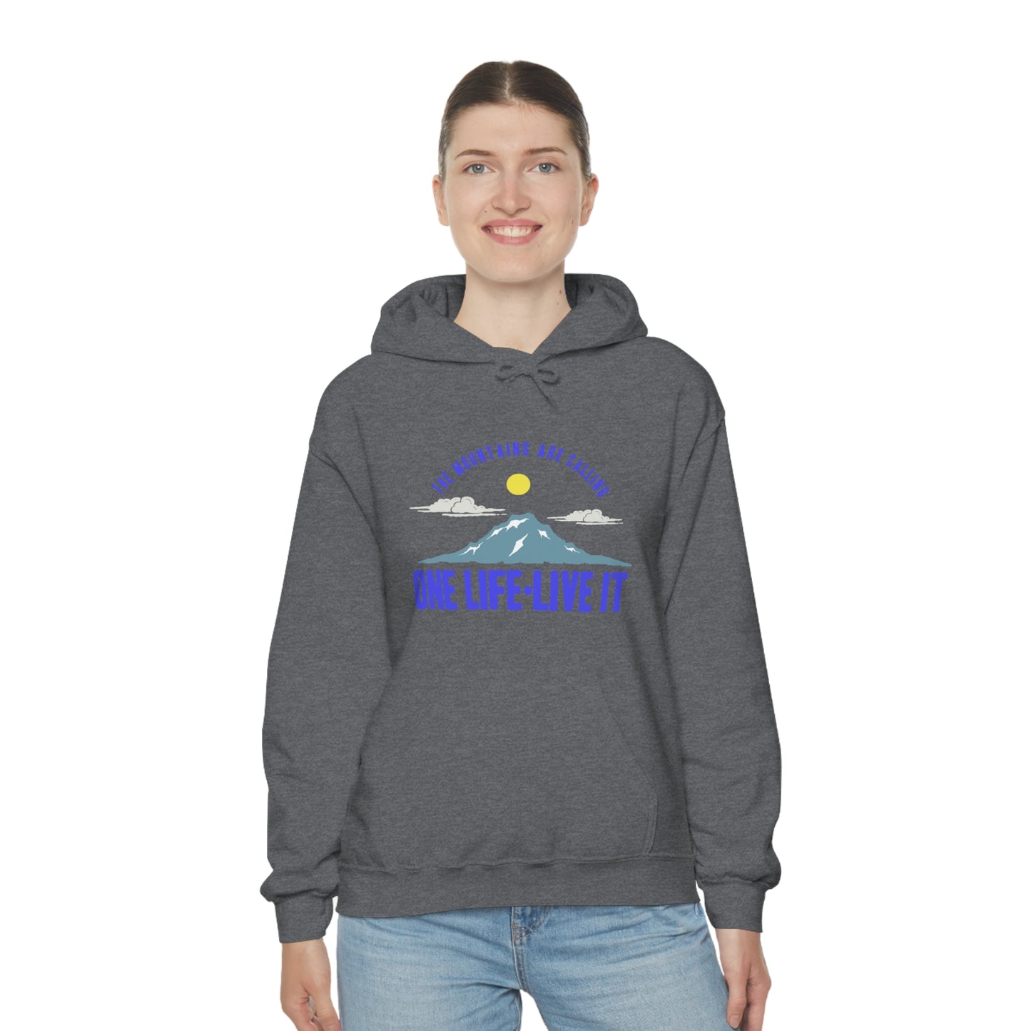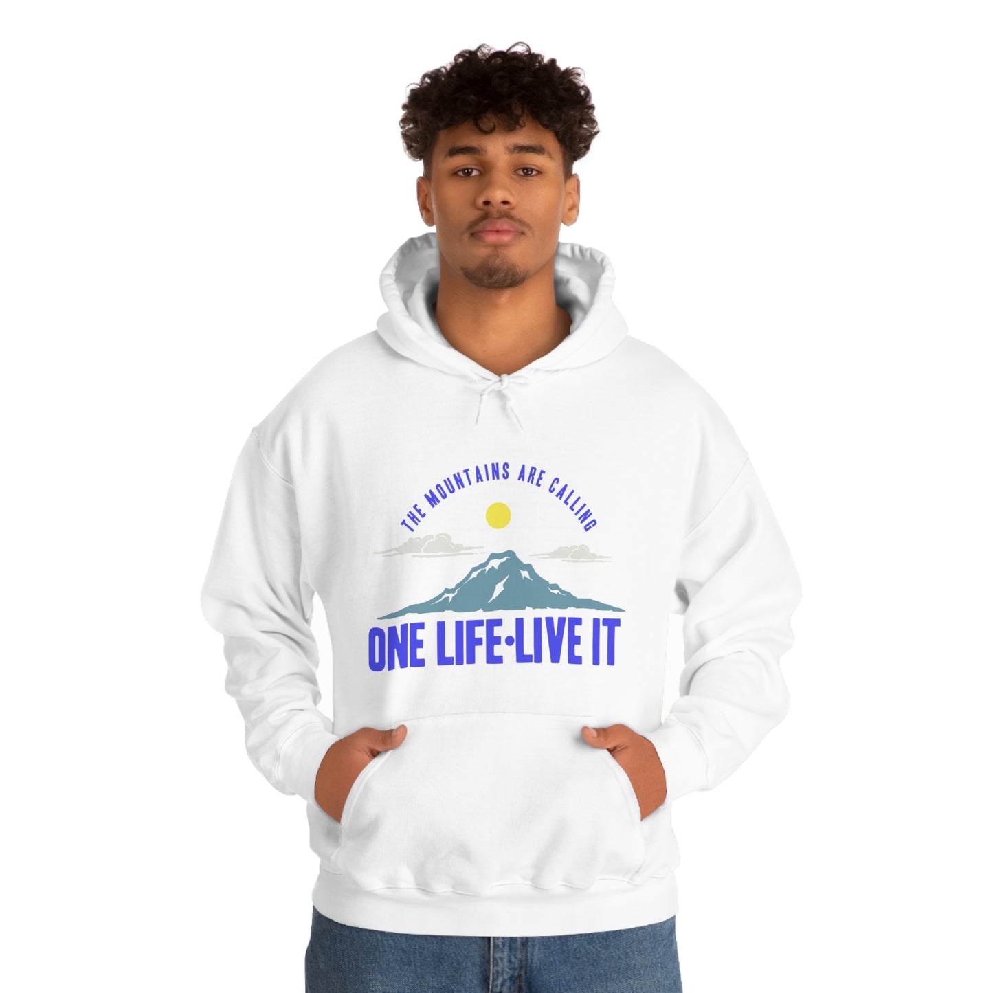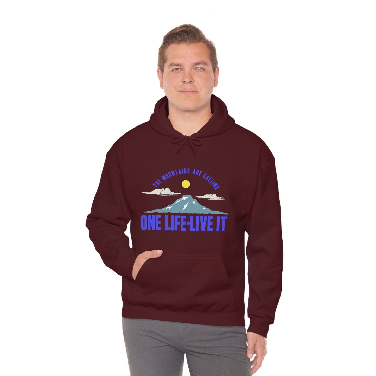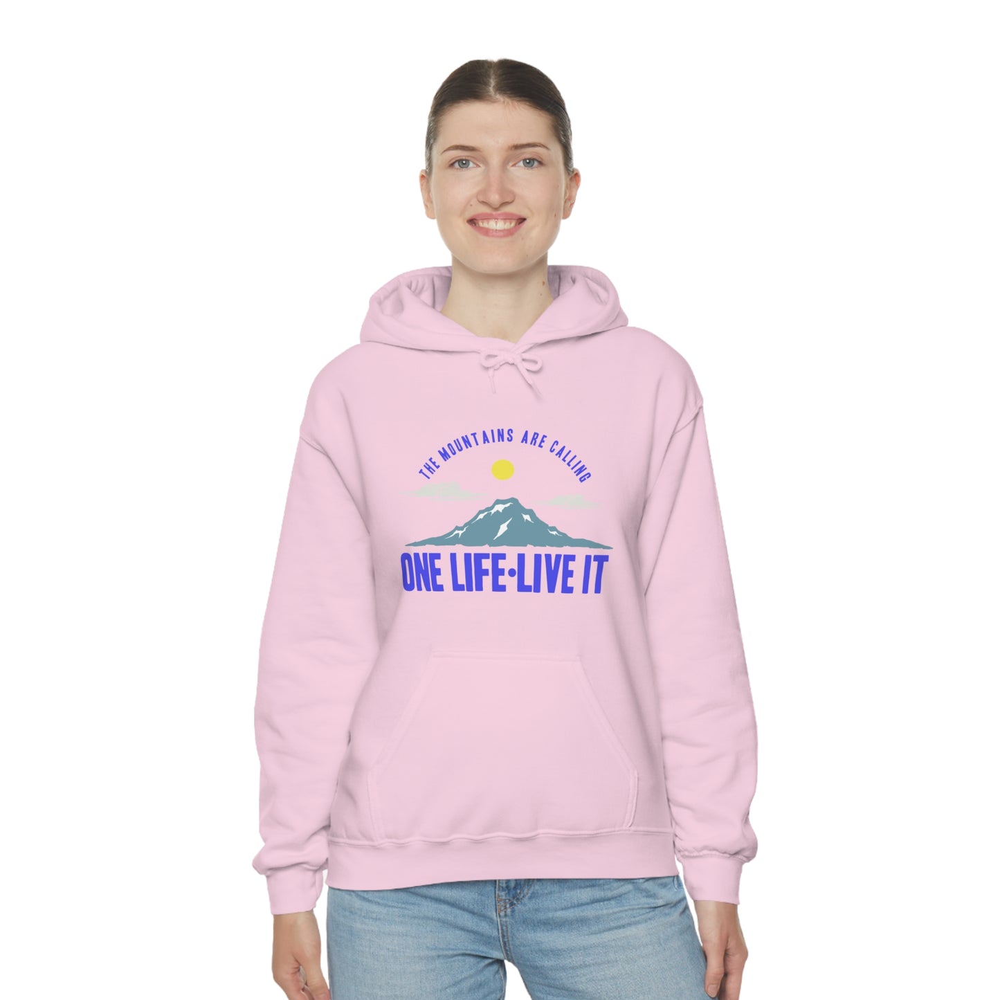 This unisex heavy blend hooded sweatshirt is relaxation itself. Made with a thick blend of cotton and polyester, it feels plush, soft and warm, a perfect choice for any cold day. In the front, the spacious kangaroo pocket adds daily practicality while the hood's drawstring is the same color as the base sweater for extra style points. Chill Stitch – Mountains One Life Live It - Unisex Hooded Hoodie Sweatshirt – Embrace Your Vibe