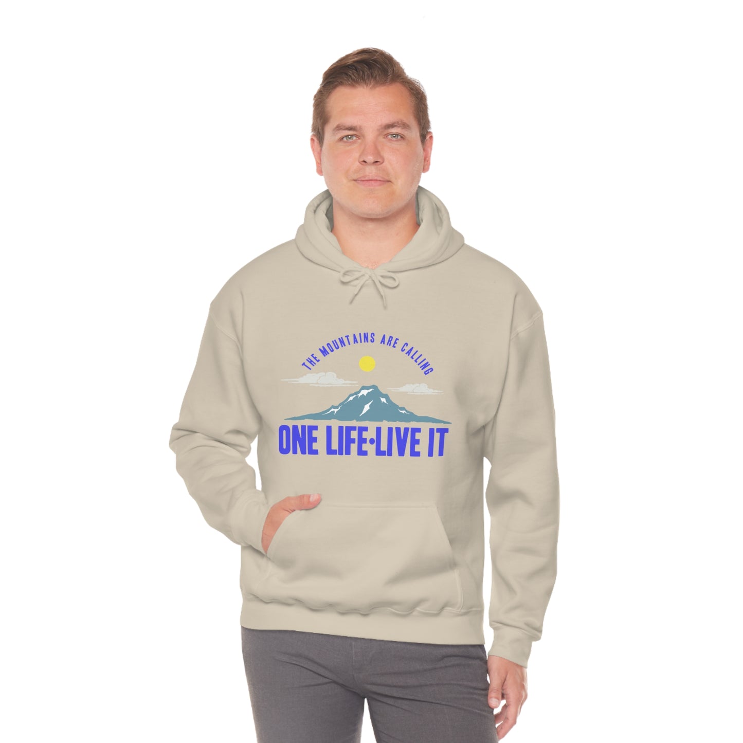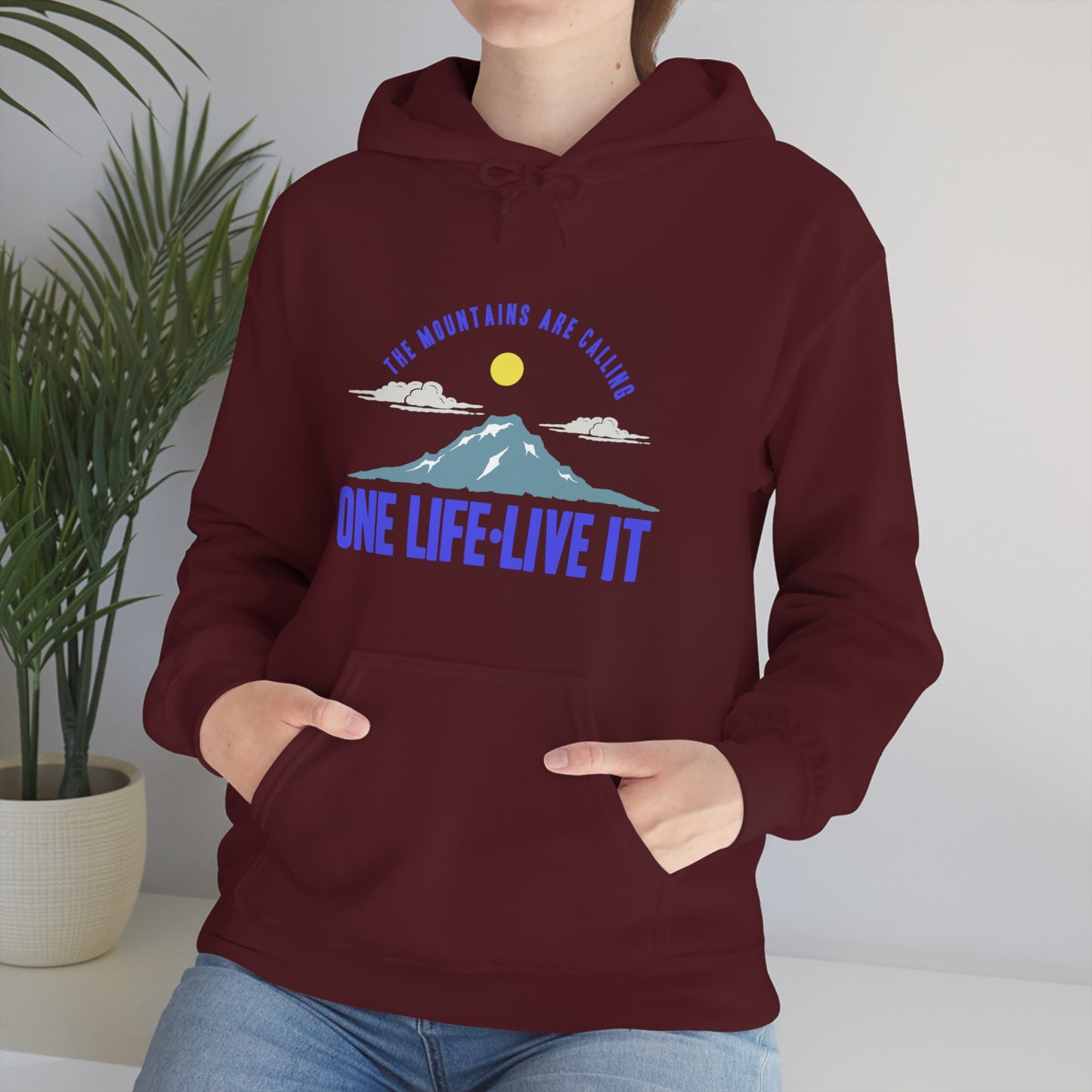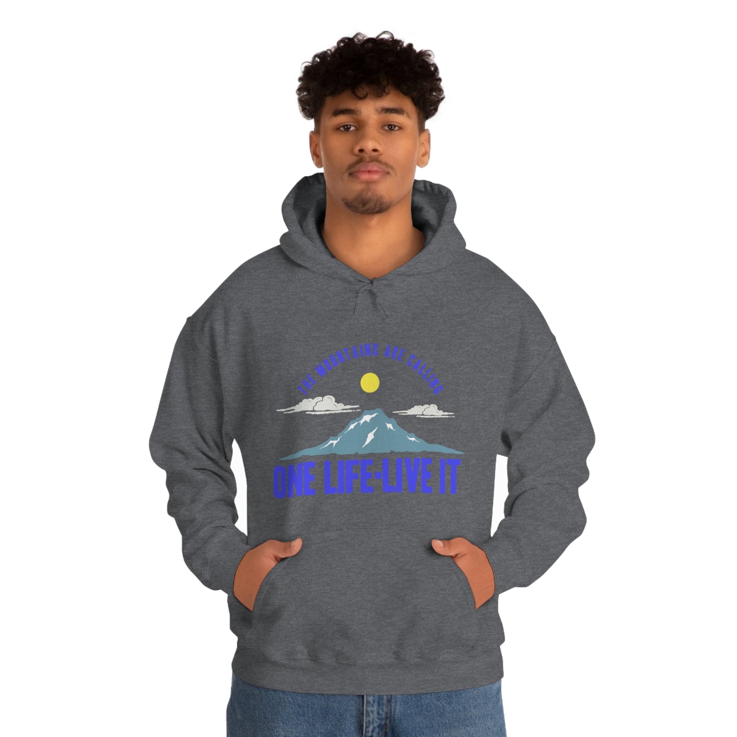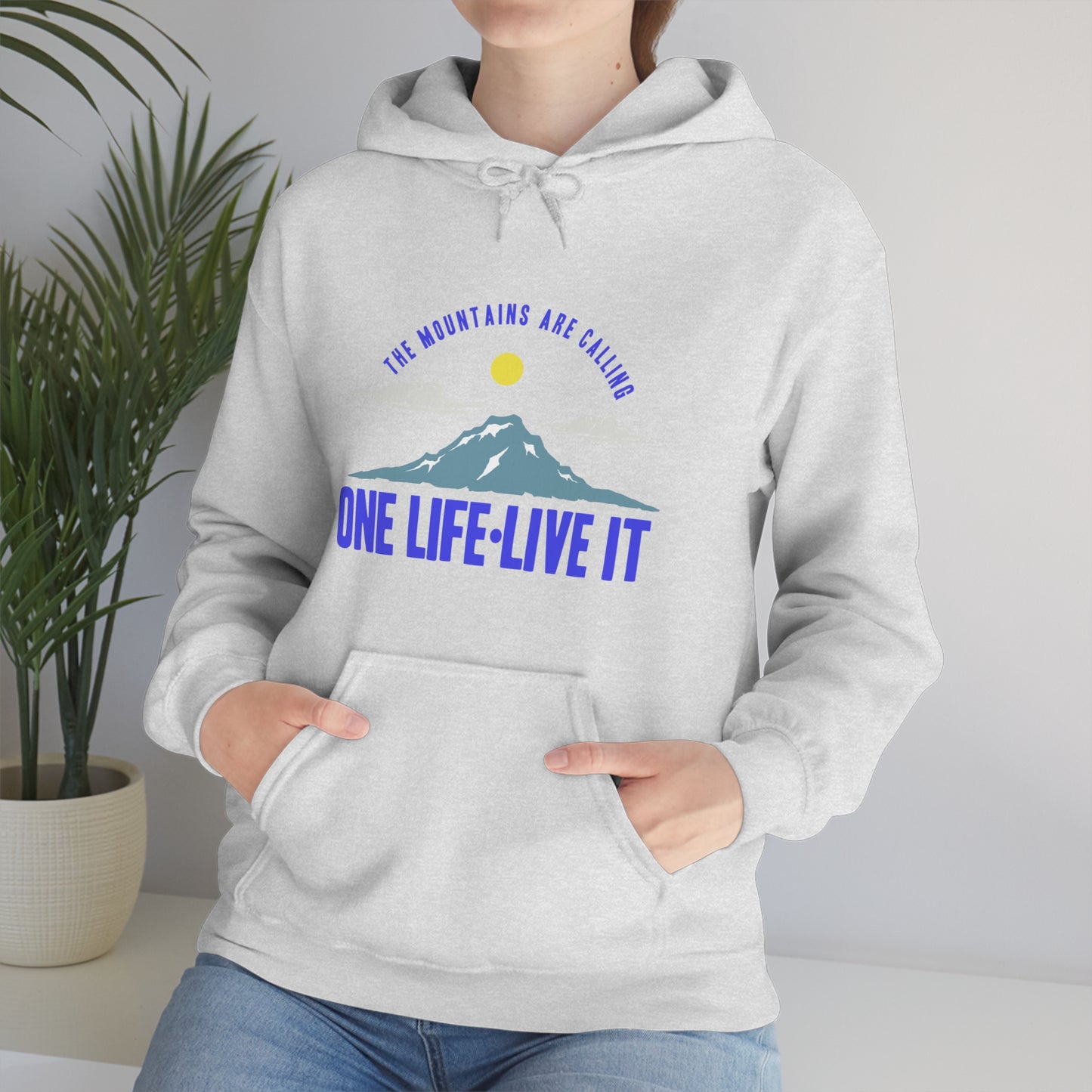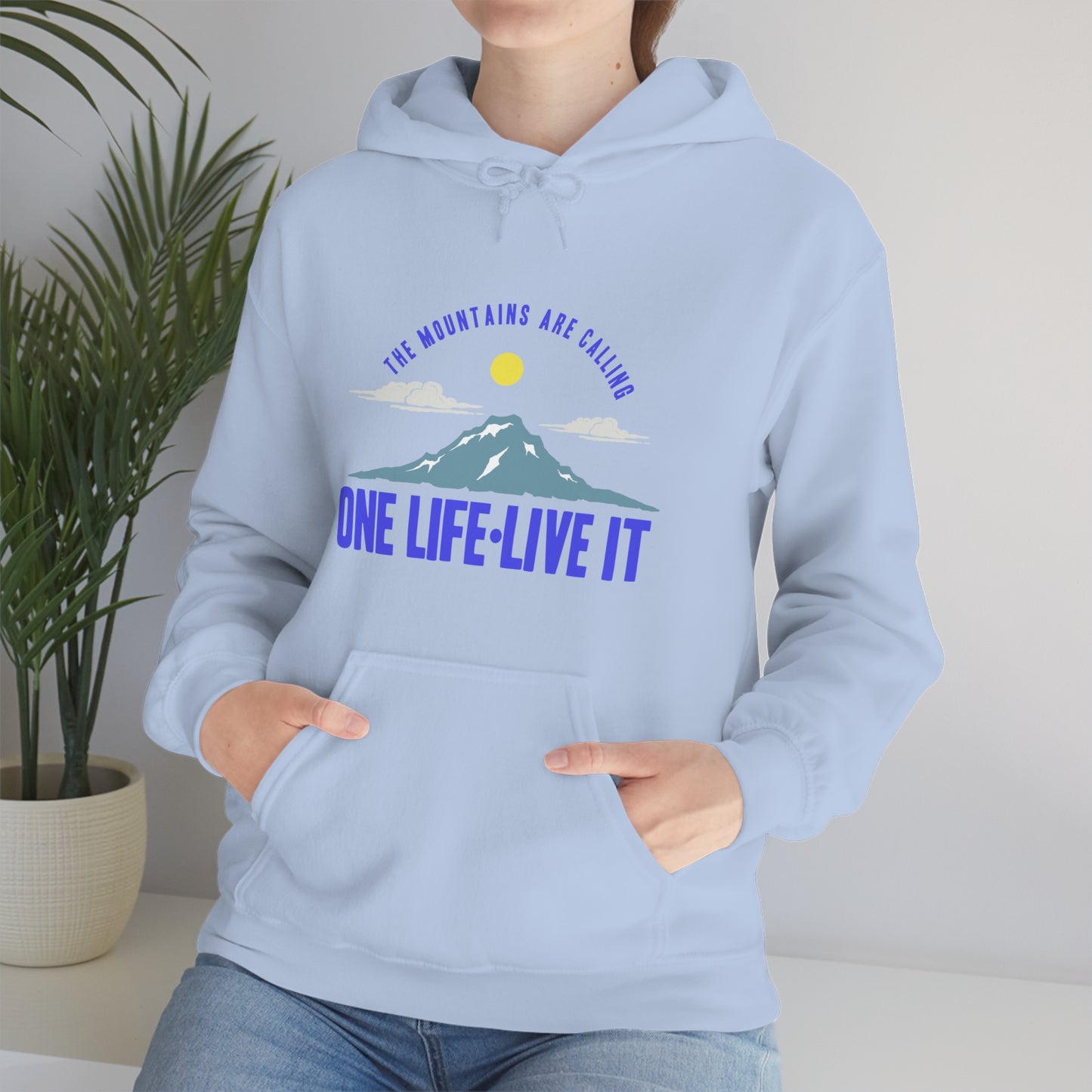 This unisex heavy blend hooded sweatshirt is relaxation itself. Made with a thick blend of cotton and polyester, it feels plush, soft and warm, a perfect choice for any cold day. In the front, the spacious kangaroo pocket adds daily practicality while the hood's drawstring is the same color as the base sweater for extra style points. Chill Stitch – Mountains One Life Live It - Unisex Hooded Hoodie Sweatshirt – Embrace Your Vibe
