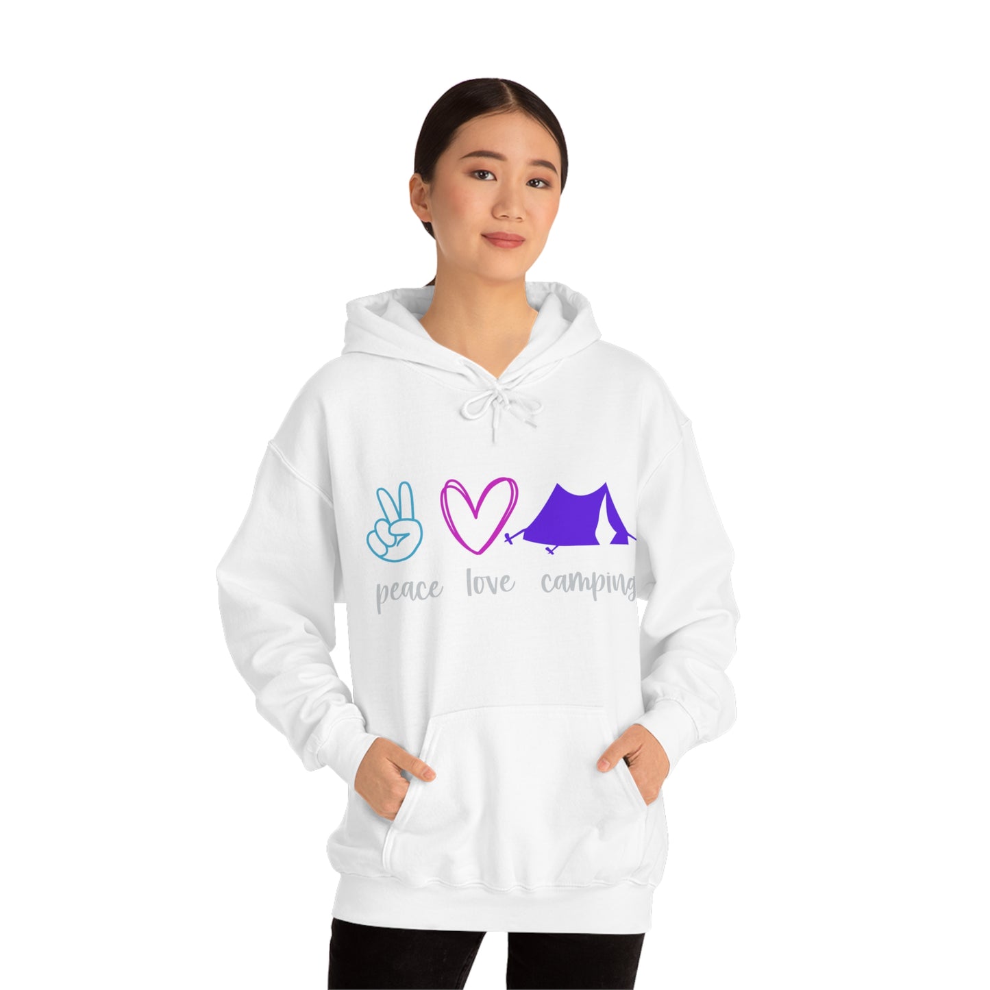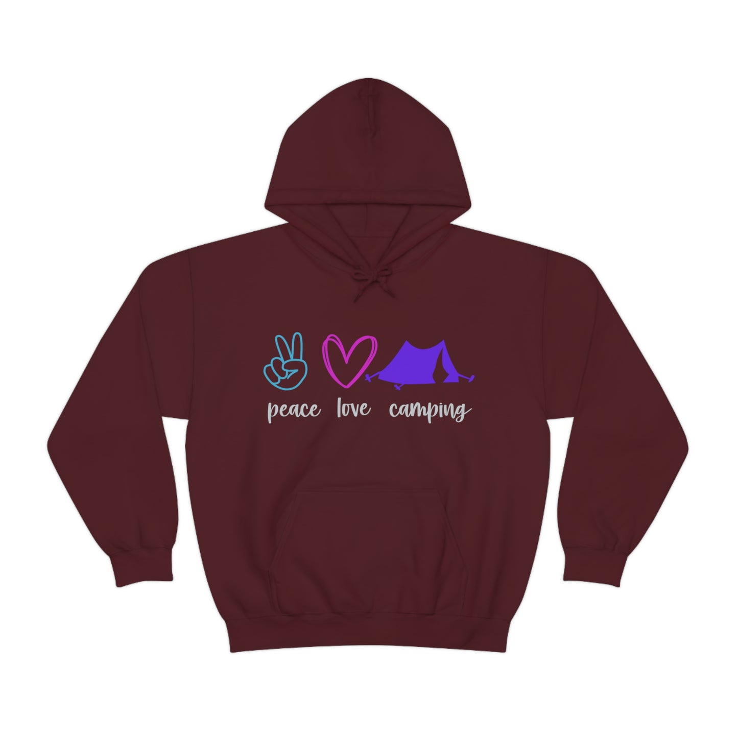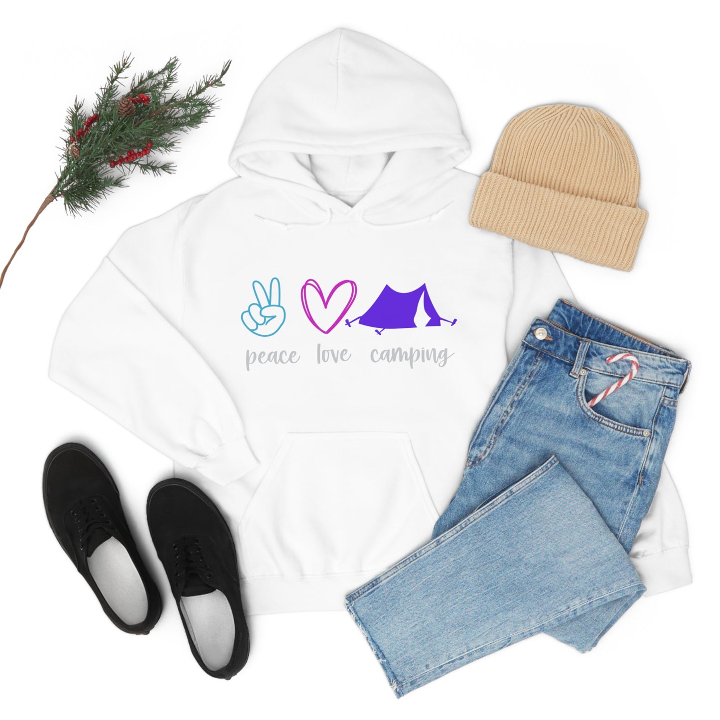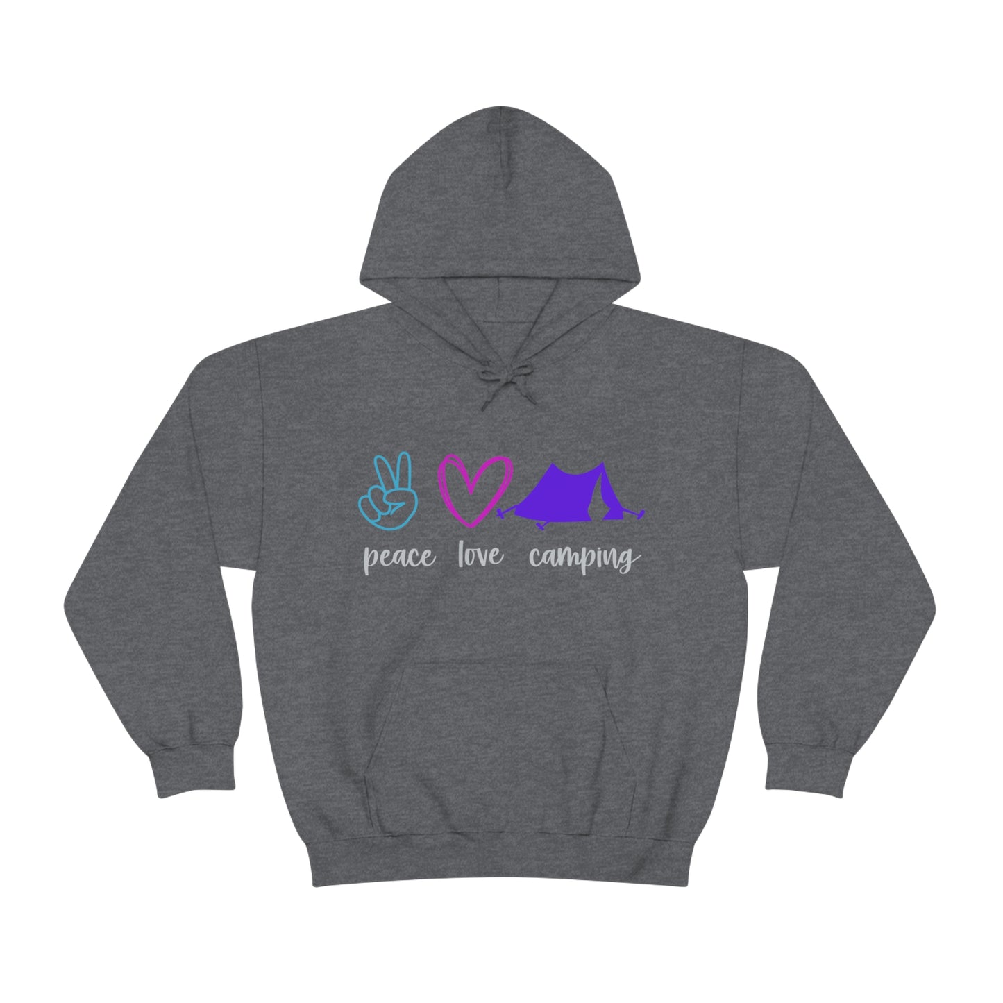 This unisex heavy blend hooded sweatshirt is relaxation itself. Made with a thick blend of cotton and polyester, it feels plush, soft and warm, a perfect choice for any cold day. In the front, the spacious kangaroo pocket adds daily practicality while the hood's drawstring is the same color as the base sweater for extra style points. Chill Stitch – Peace Love Camping - Unisex Hooded Hoodie Sweatshirt – Embrace Your Vibe