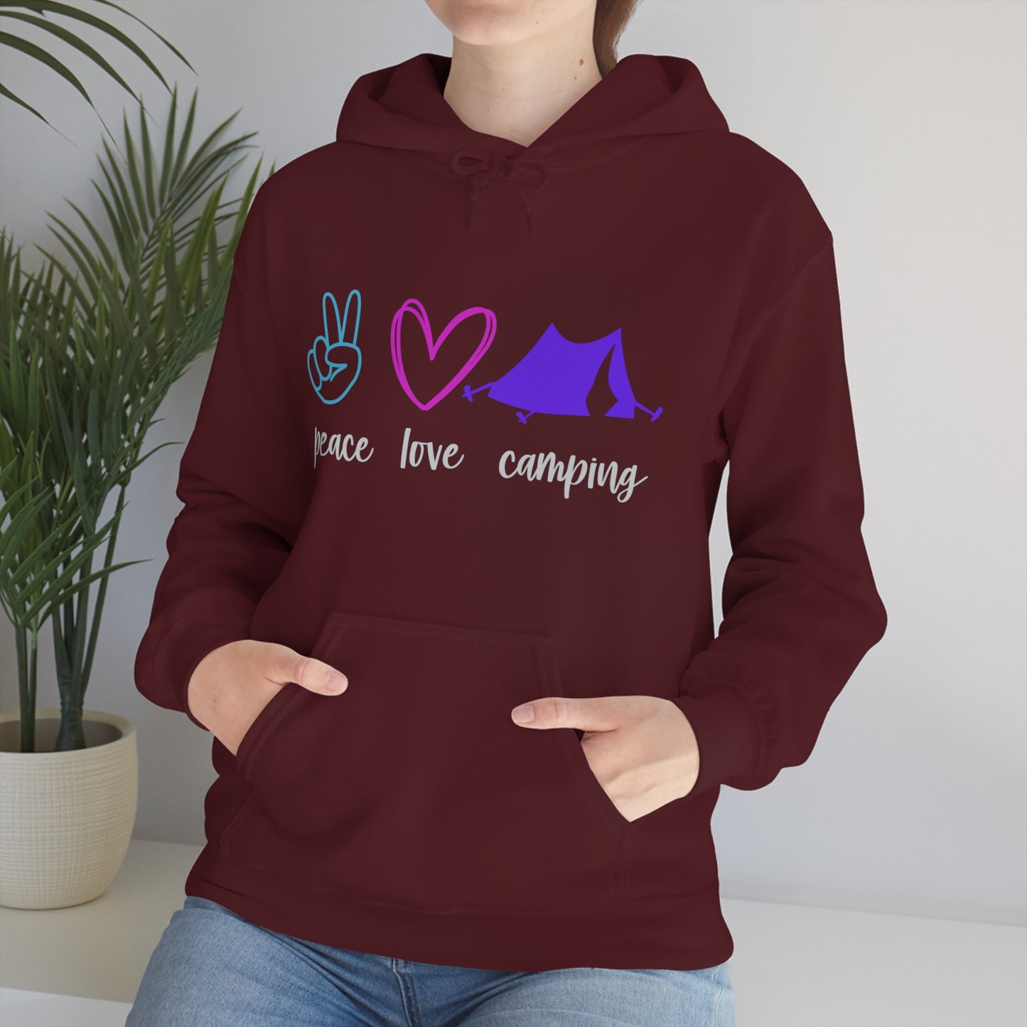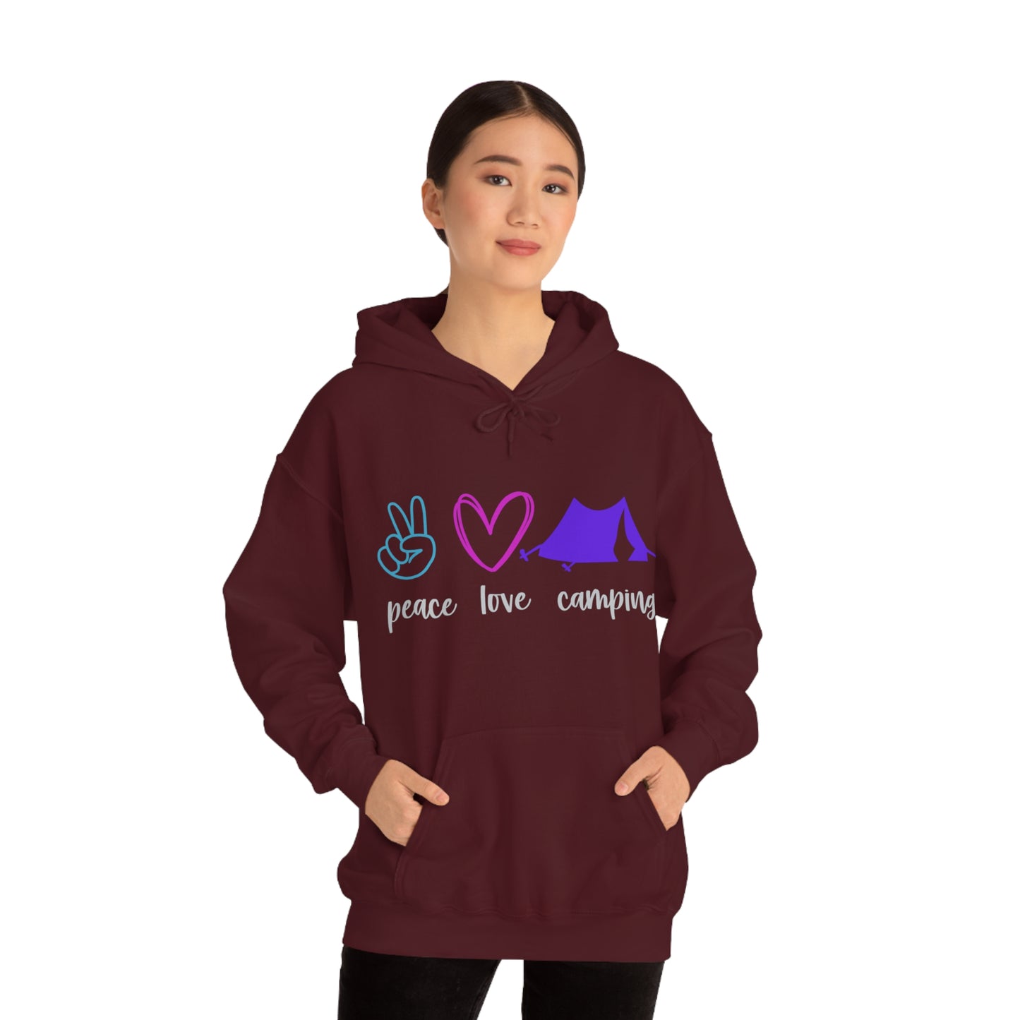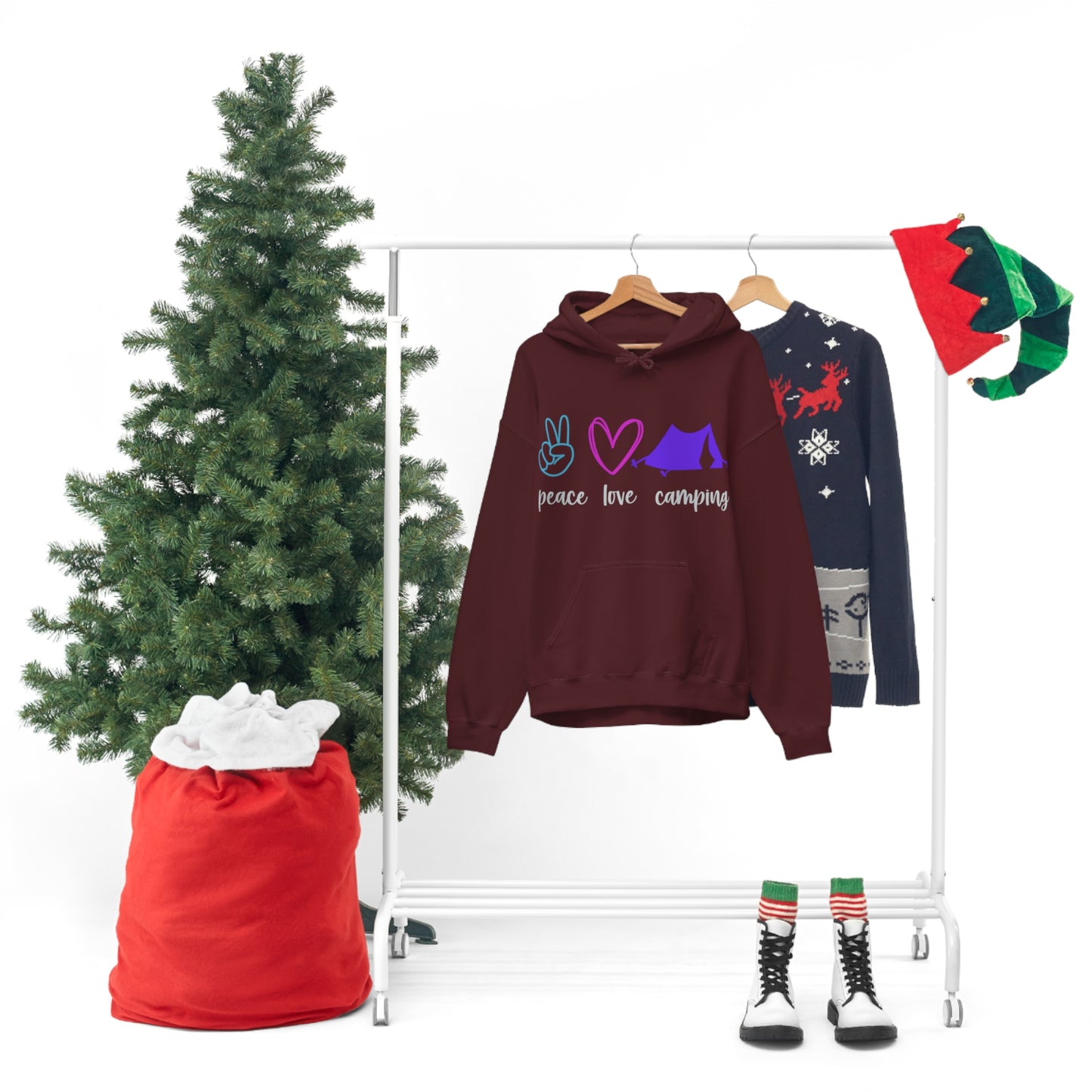 This unisex heavy blend hooded sweatshirt is relaxation itself. Made with a thick blend of cotton and polyester, it feels plush, soft and warm, a perfect choice for any cold day. In the front, the spacious kangaroo pocket adds daily practicality while the hood's drawstring is the same color as the base sweater for extra style points. Chill Stitch – Peace Love Camping - Unisex Hooded Hoodie Sweatshirt – Embrace Your Vibe