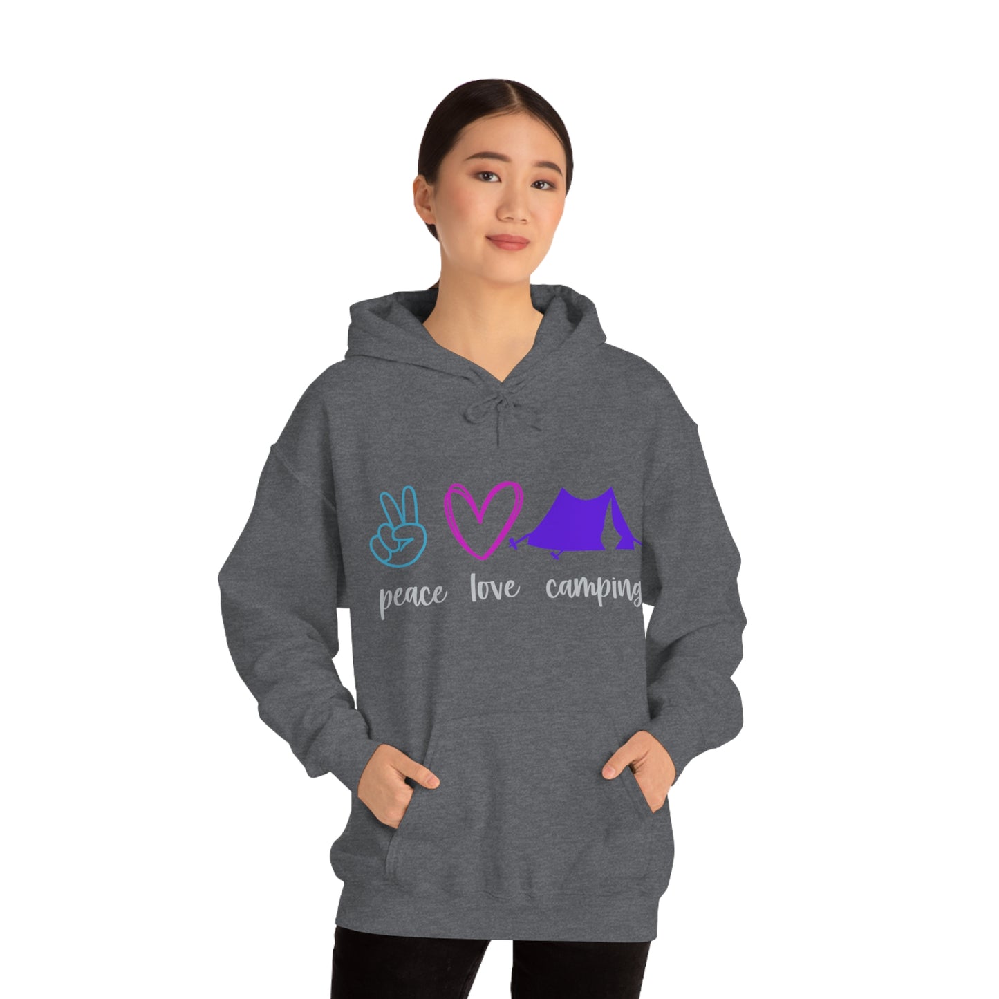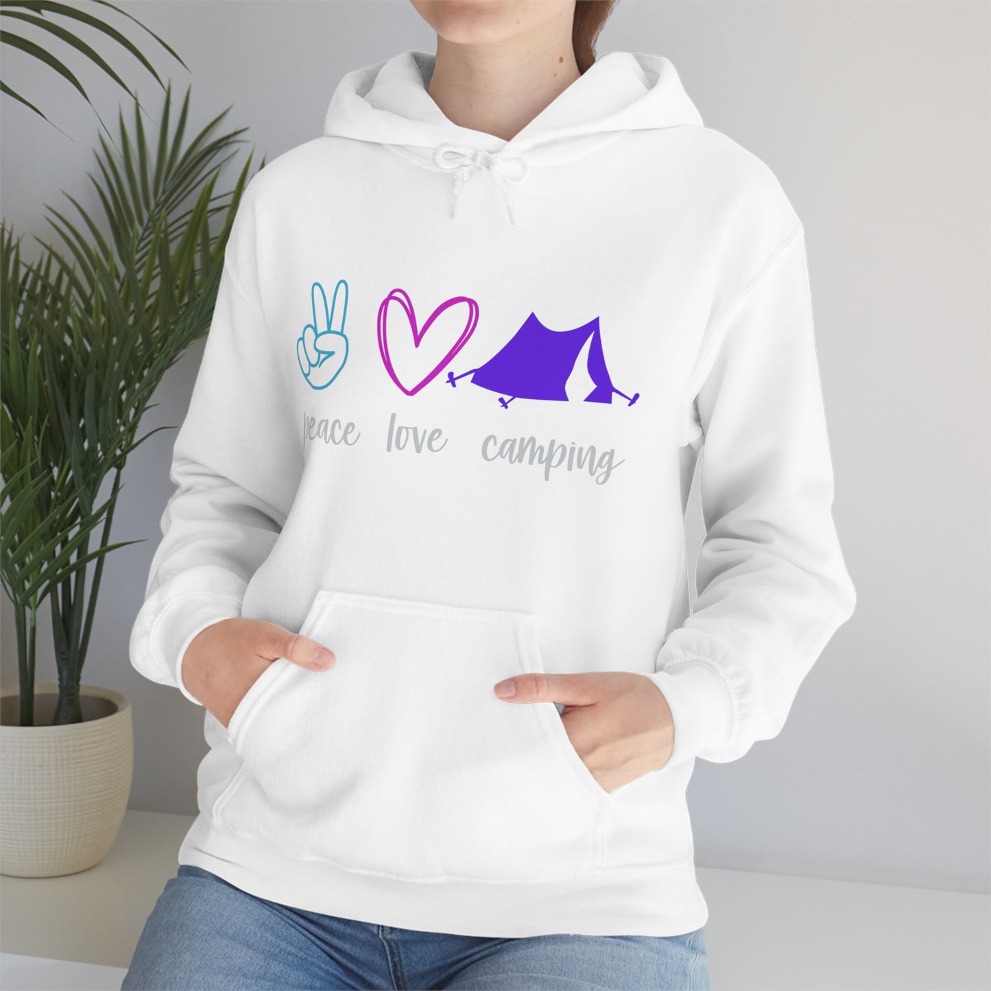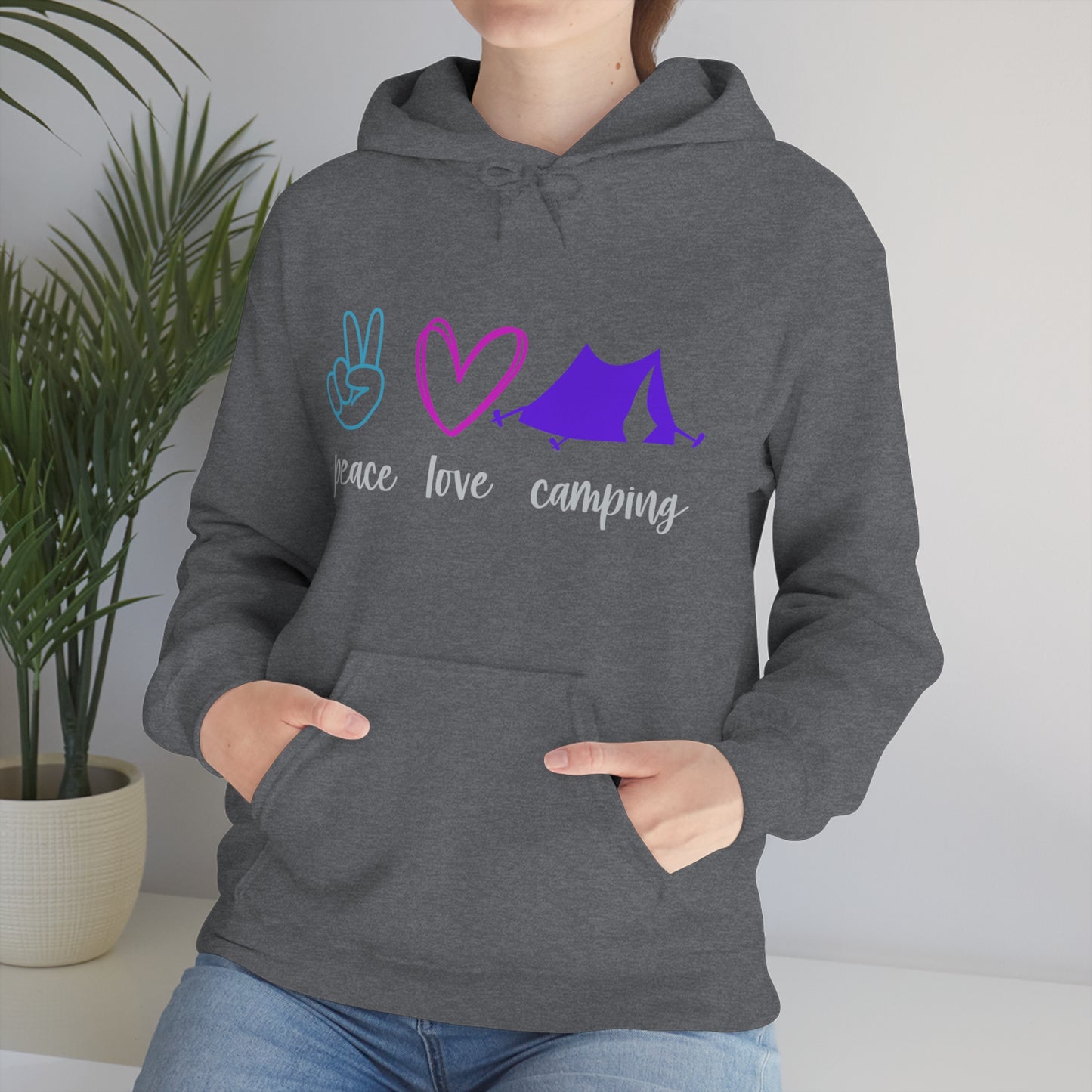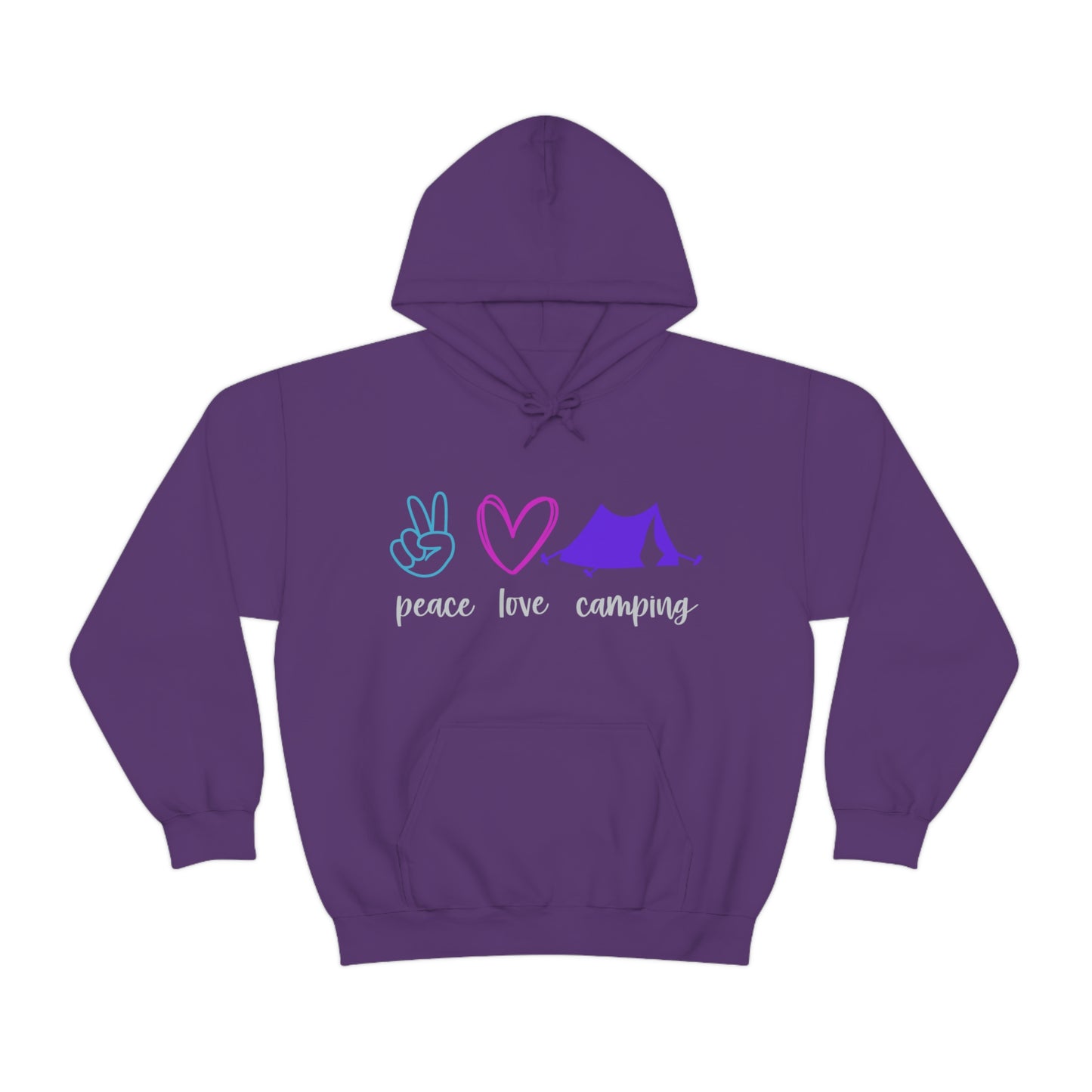 This unisex heavy blend hooded sweatshirt is relaxation itself. Made with a thick blend of cotton and polyester, it feels plush, soft and warm, a perfect choice for any cold day. In the front, the spacious kangaroo pocket adds daily practicality while the hood's drawstring is the same color as the base sweater for extra style points. Chill Stitch – Peace Love Camping - Unisex Hooded Hoodie Sweatshirt – Embrace Your Vibe
