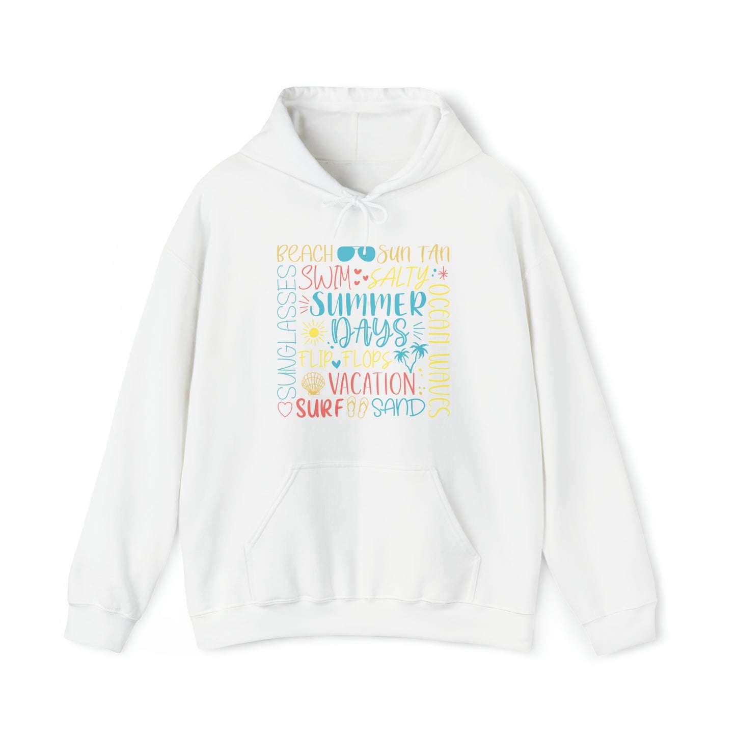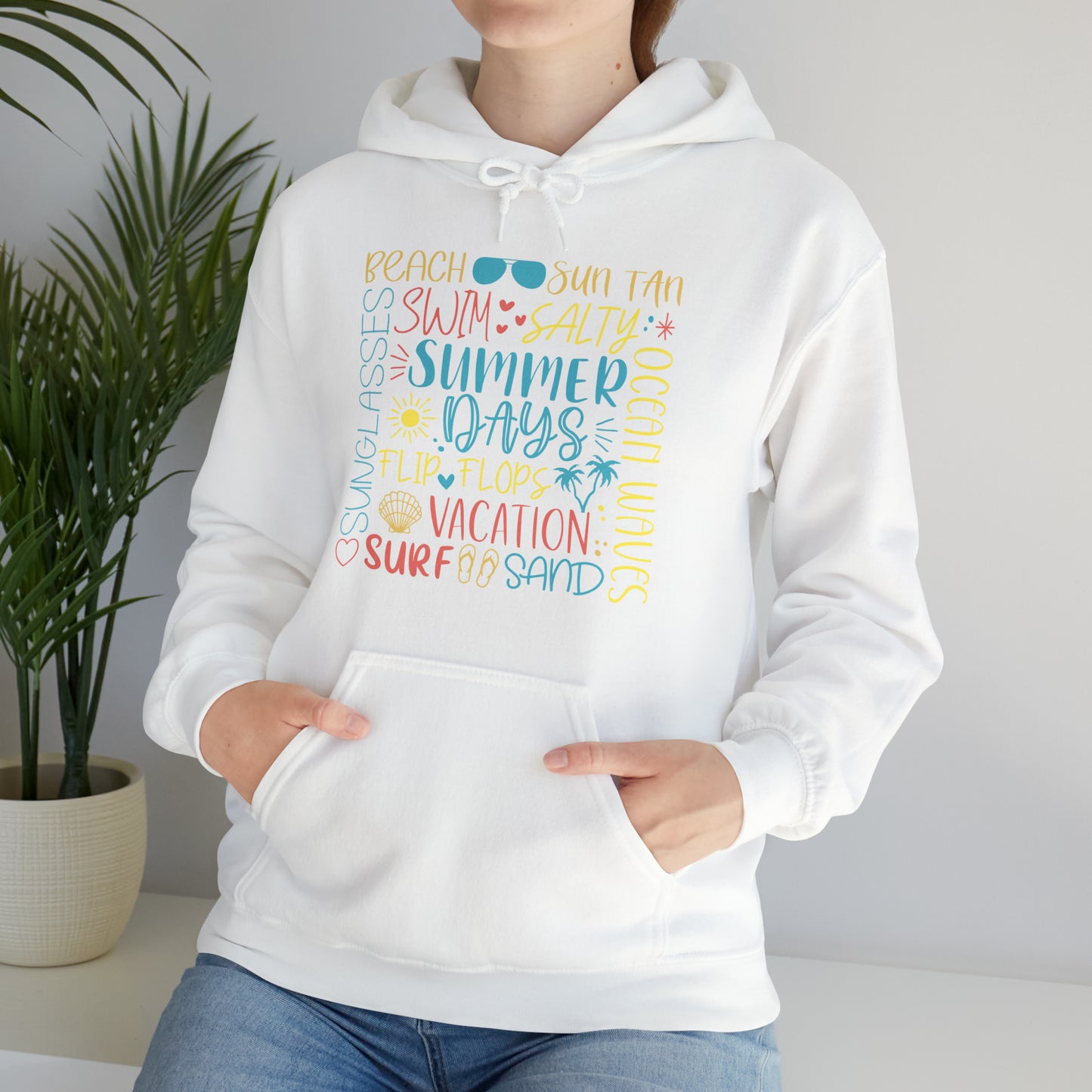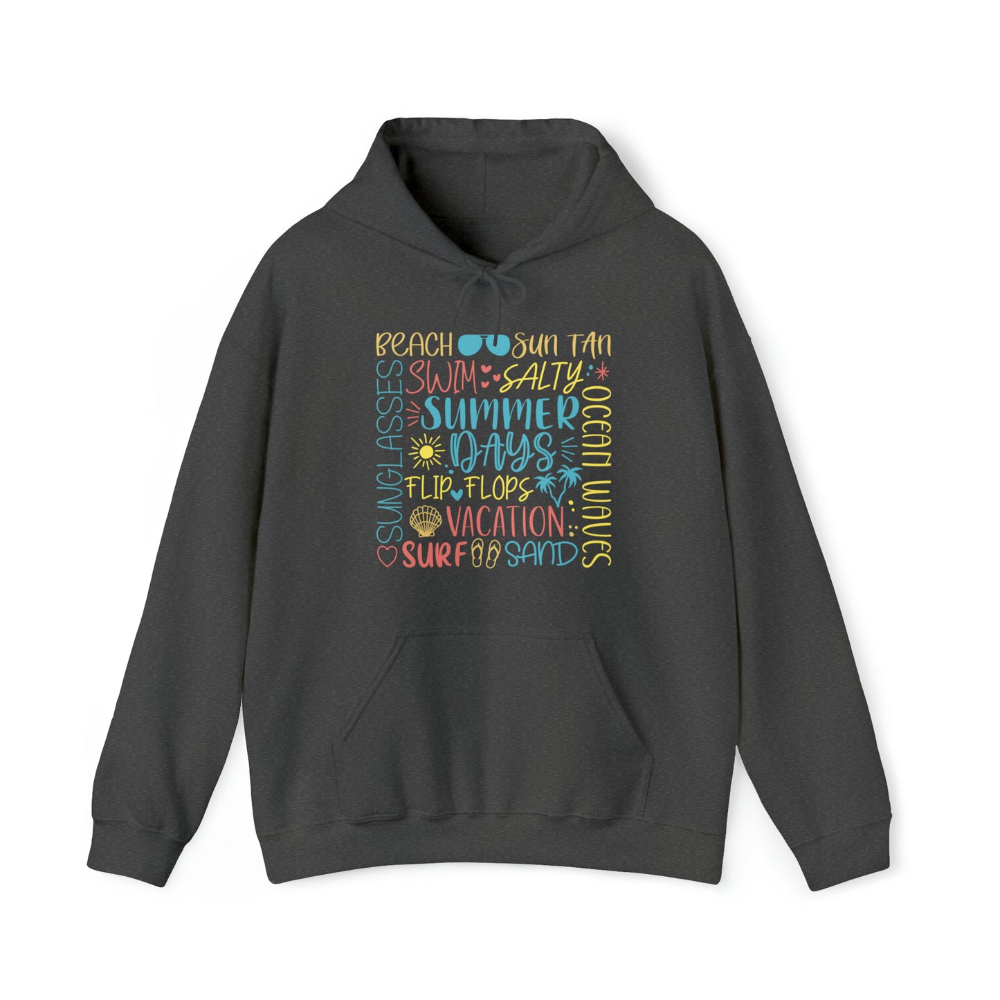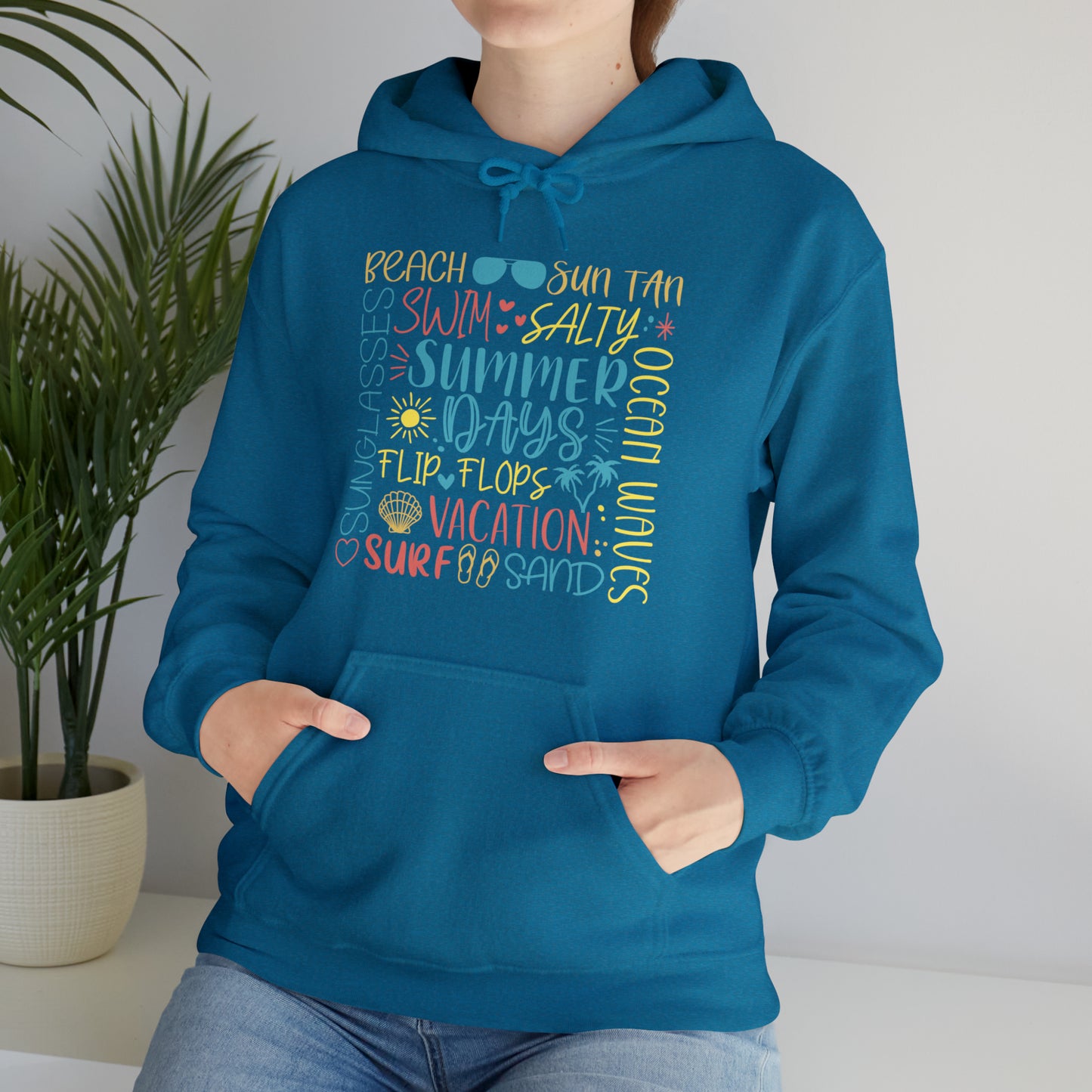 This unisex heavy blend hooded sweatshirt is relaxation itself. Made with a thick blend of cotton and polyester, it feels plush, soft and warm, a perfect choice for any cold day. In the front, the spacious kangaroo pocket adds daily practicality while the hood's drawstring is the same color as the base sweater for extra style points. Chill Stitch – Summer Life Vacation - Unisex Hooded Hoodie Sweatshirt – Embrace Your Vibe