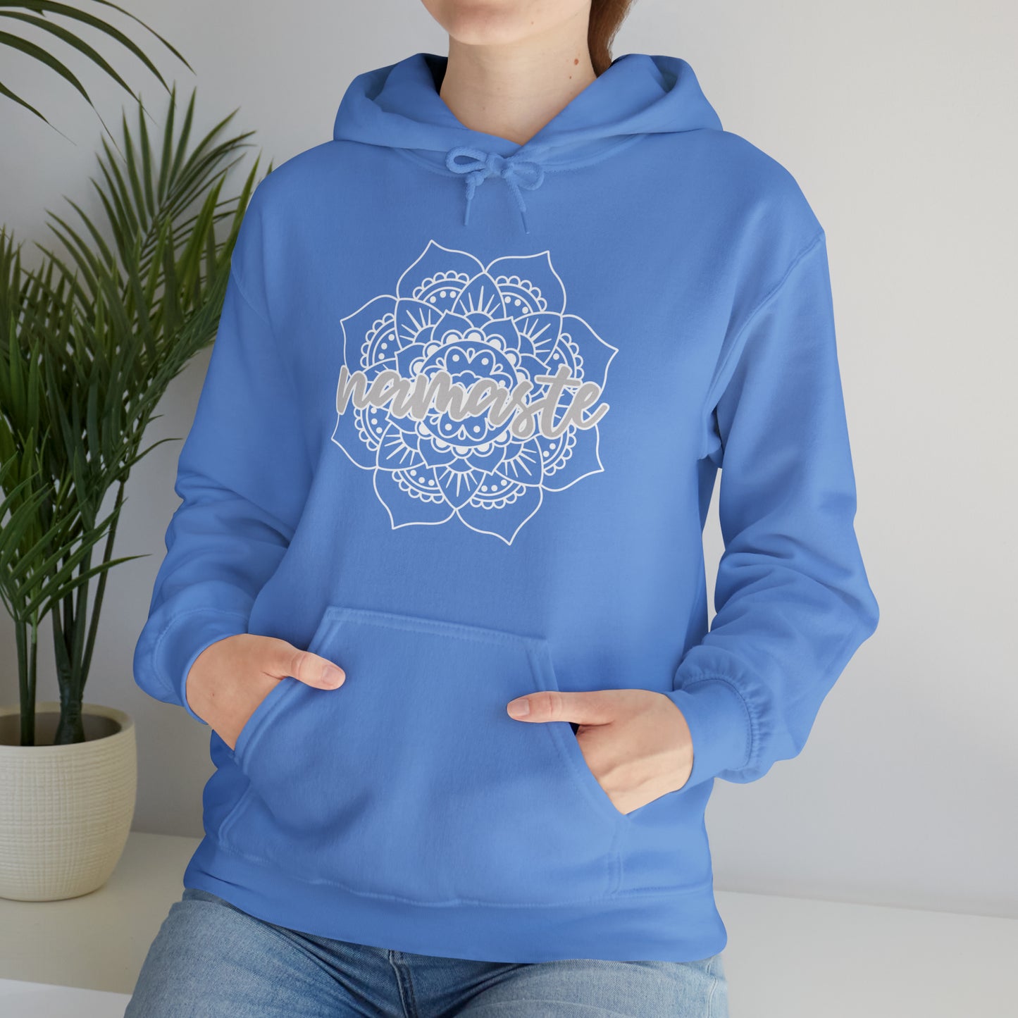This unisex heavy blend hooded sweatshirt is relaxation itself. Made with a thick blend of cotton and polyester, it feels plush, soft and warm, a perfect choice for any cold day. In the front, the spacious kangaroo pocket adds daily practicality while the hood's drawstring is the same color as the base sweater for extra style points. Chill Stitch – Namaste Mandala - Unisex Hooded Hoodie Sweatshirt – Embrace Your Vibe