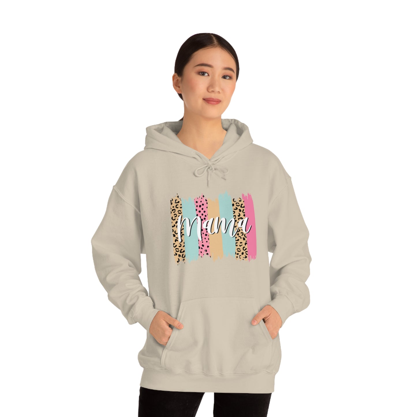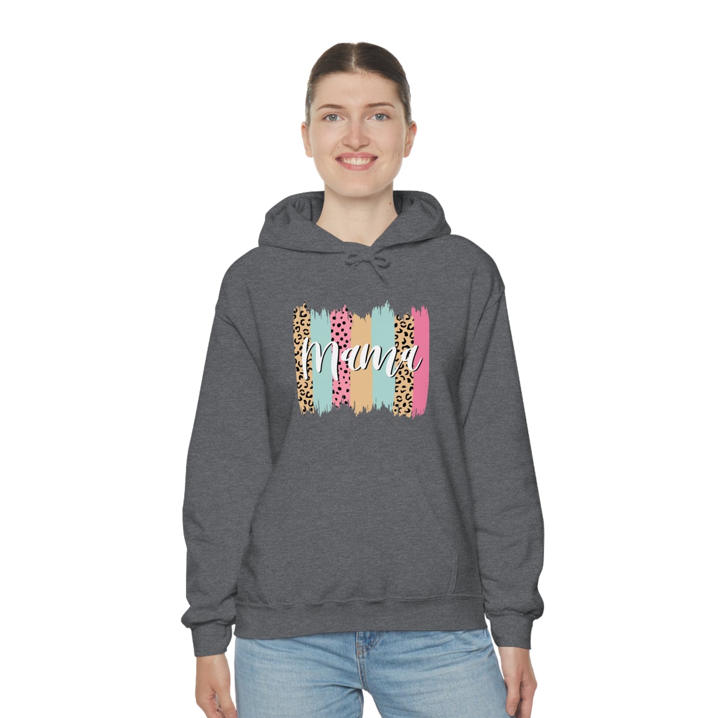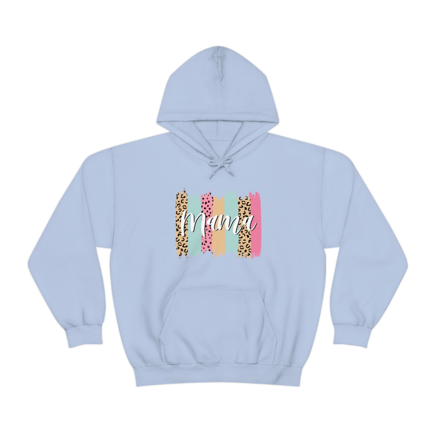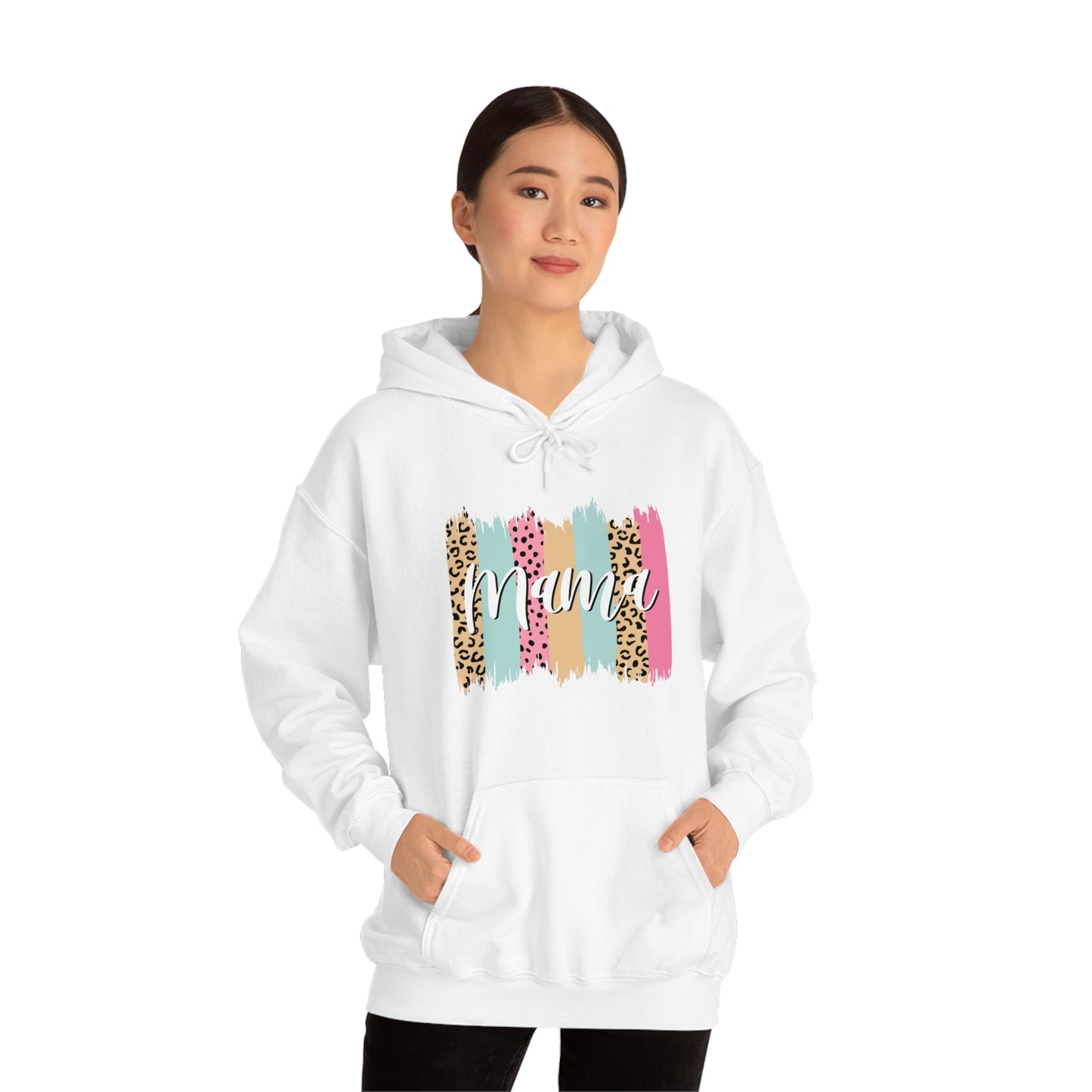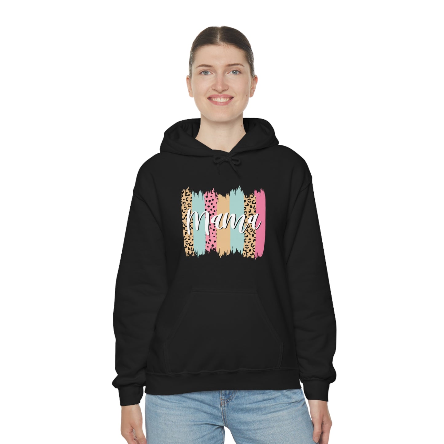 This unisex heavy blend hooded sweatshirt is relaxation itself. Made with a thick blend of cotton and polyester, it feels plush, soft and warm, a perfect choice for any cold day. In the front, the spacious kangaroo pocket adds daily practicality while the hood's drawstring is the same color as the base sweater for extra style points. Chill Stitch – Leopard Paint Strokes Mama - Unisex Hooded Hoodie Sweatshirt – Embrace Your Vibe