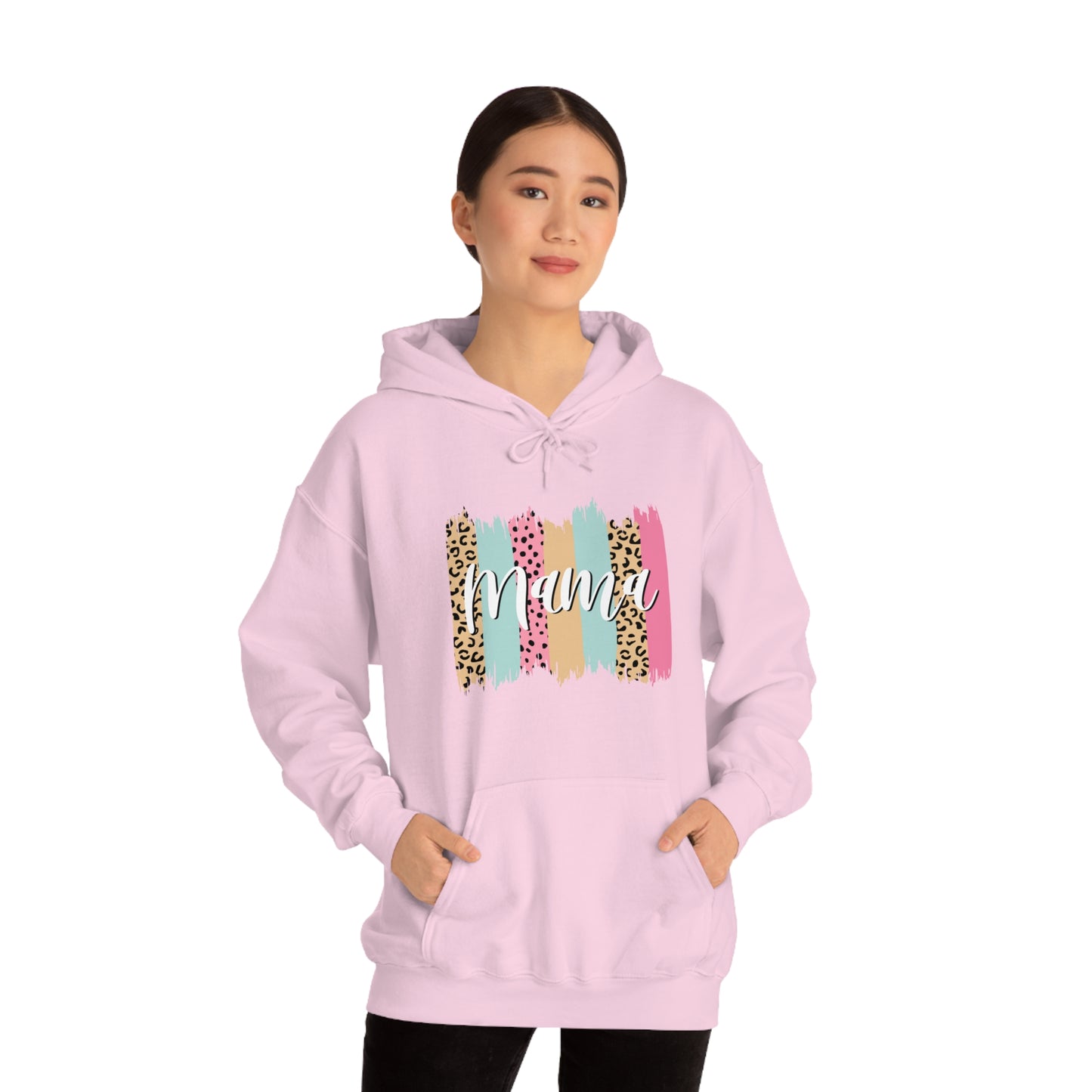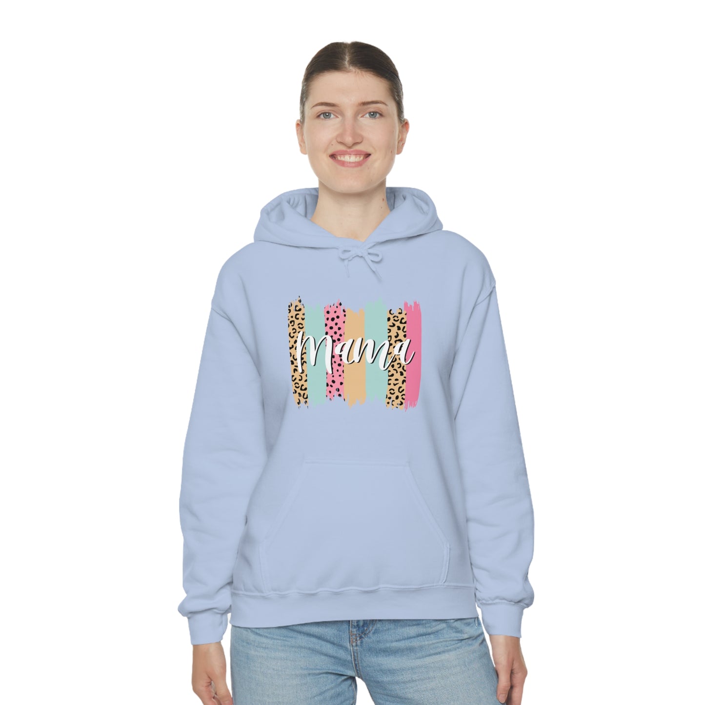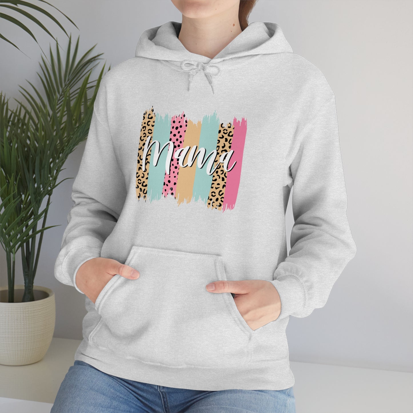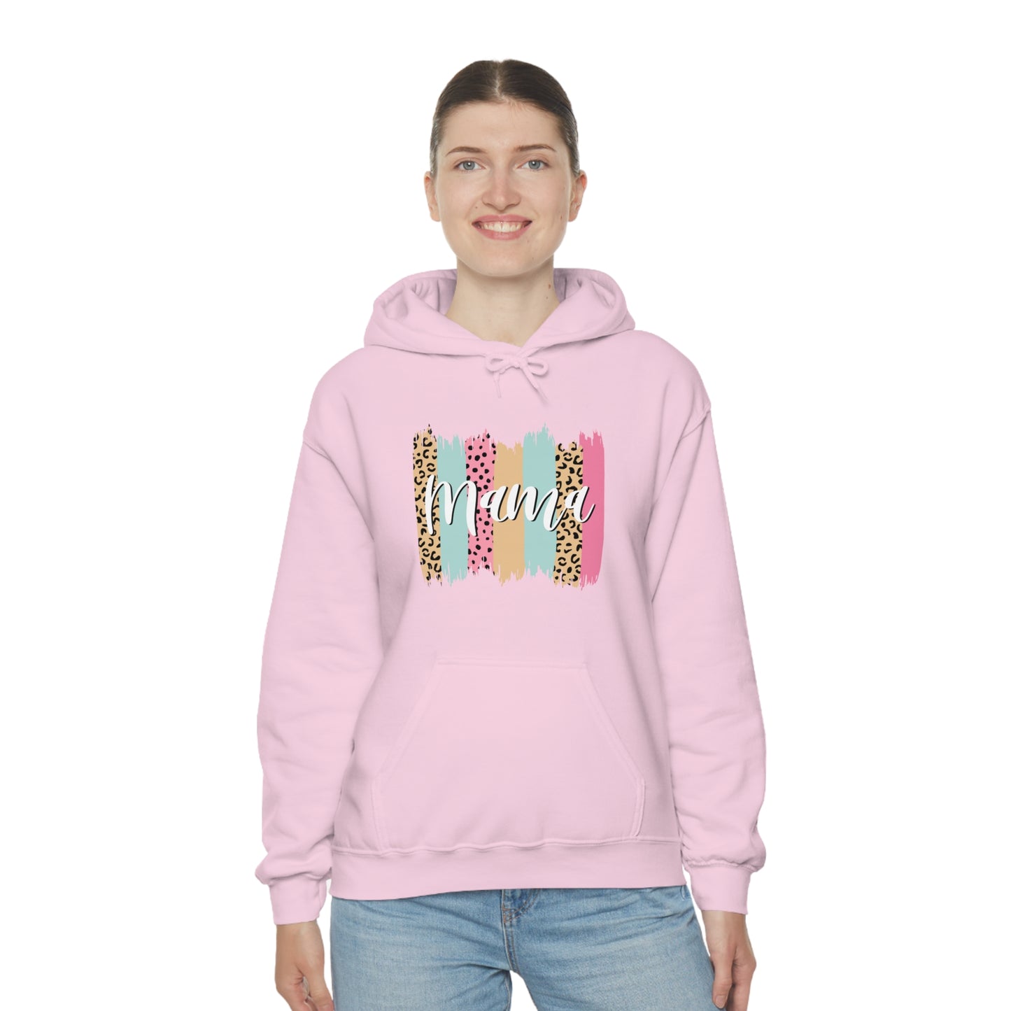 This unisex heavy blend hooded sweatshirt is relaxation itself. Made with a thick blend of cotton and polyester, it feels plush, soft and warm, a perfect choice for any cold day. In the front, the spacious kangaroo pocket adds daily practicality while the hood's drawstring is the same color as the base sweater for extra style points. Chill Stitch – Leopard Paint Strokes Mama - Unisex Hooded Hoodie Sweatshirt – Embrace Your Vibe