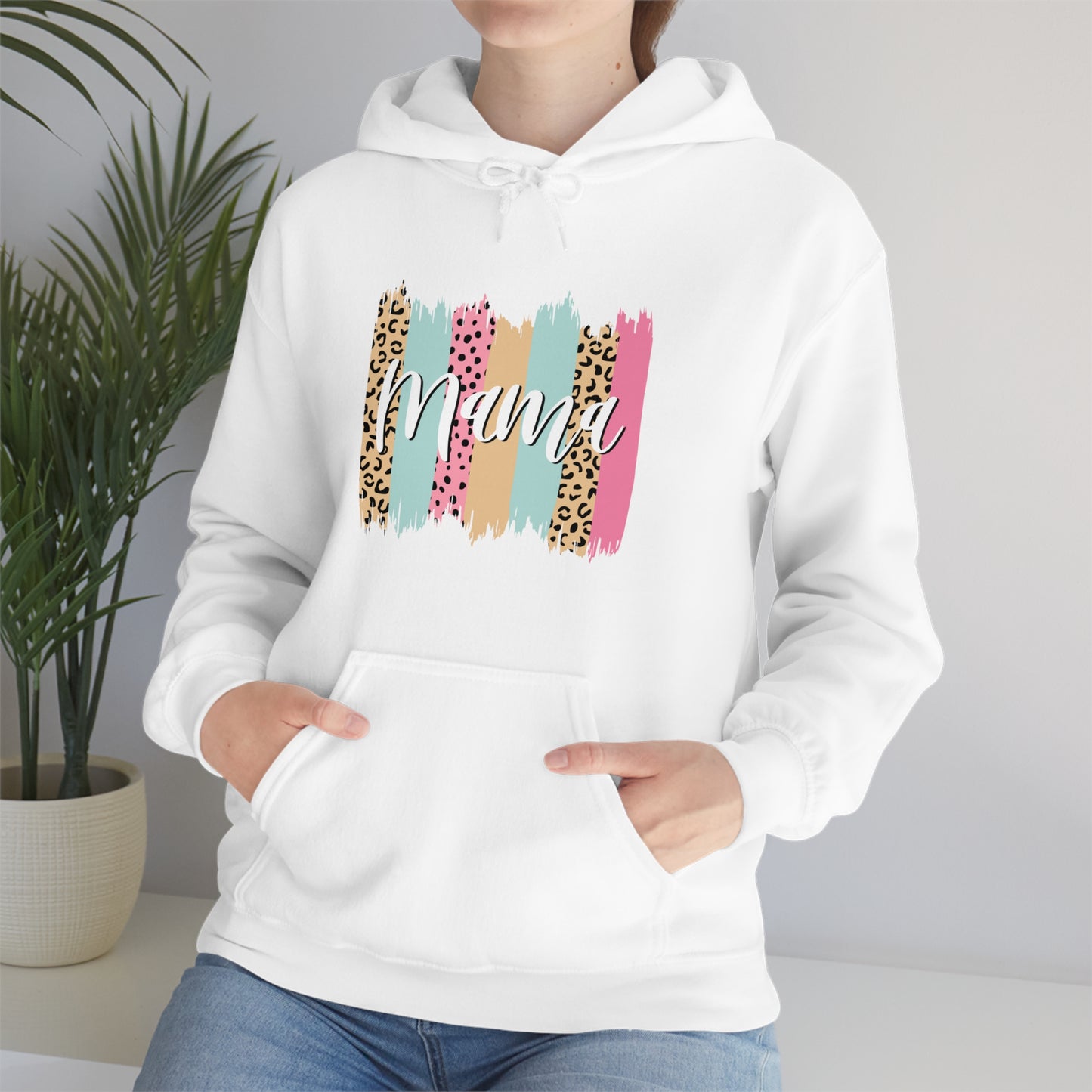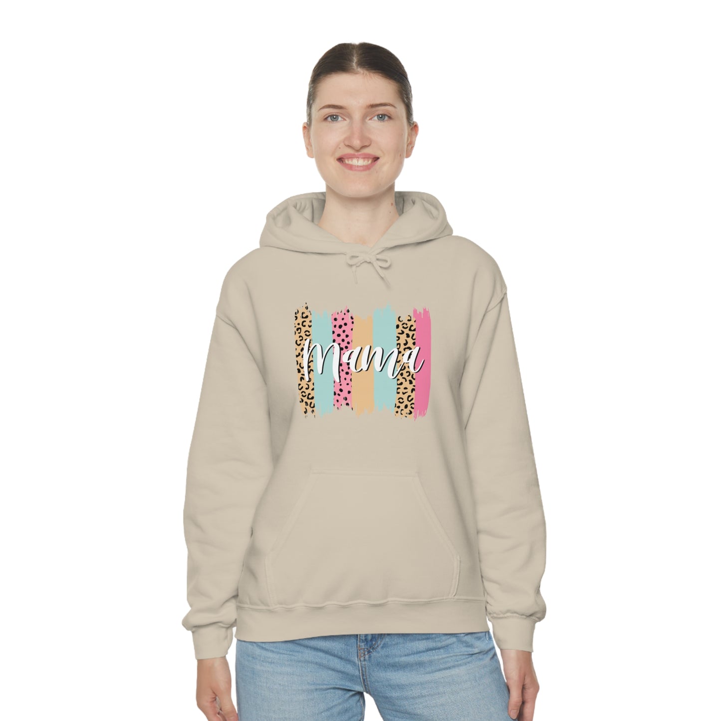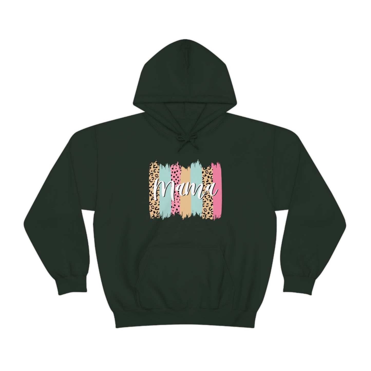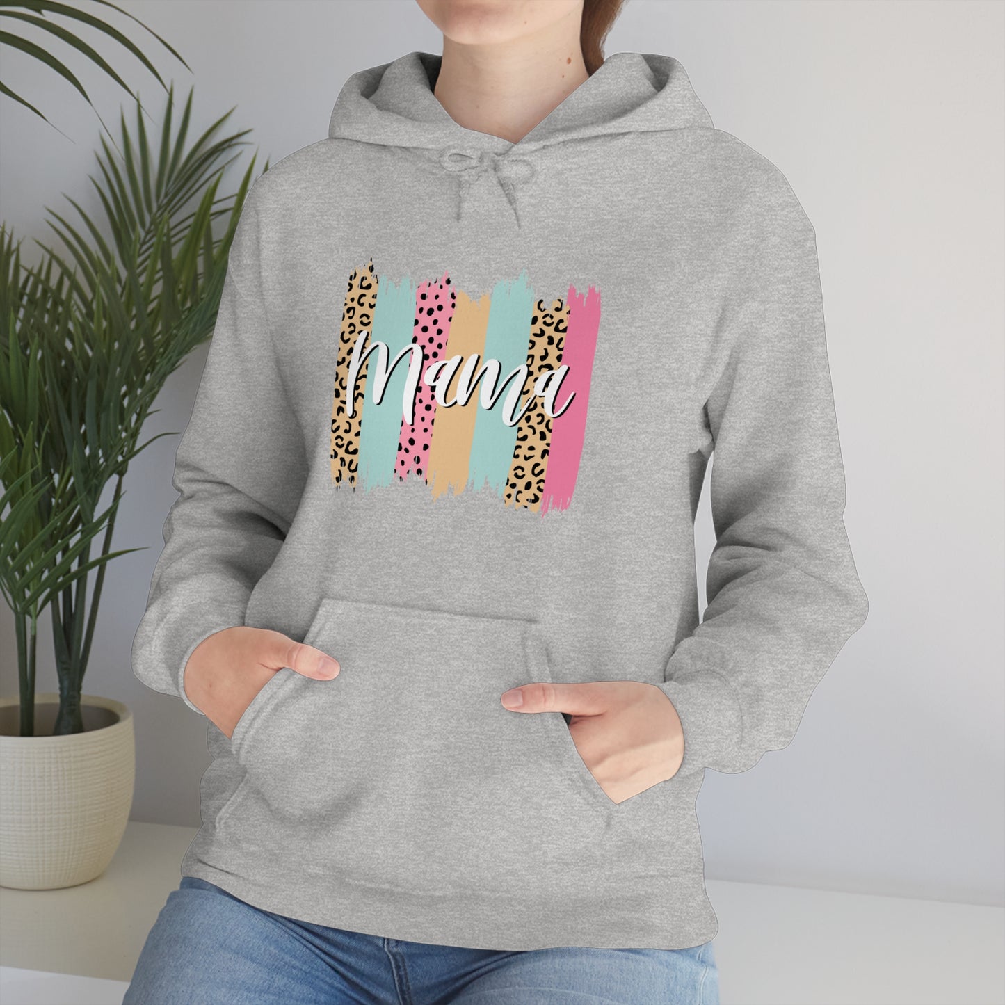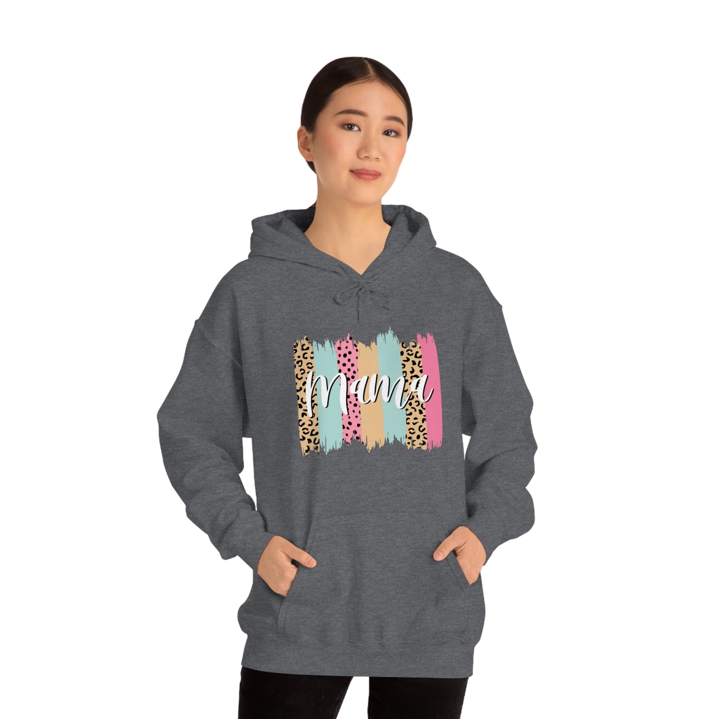 This unisex heavy blend hooded sweatshirt is relaxation itself. Made with a thick blend of cotton and polyester, it feels plush, soft and warm, a perfect choice for any cold day. In the front, the spacious kangaroo pocket adds daily practicality while the hood's drawstring is the same color as the base sweater for extra style points. Chill Stitch – Leopard Paint Strokes Mama - Unisex Hooded Hoodie Sweatshirt – Embrace Your Vibe