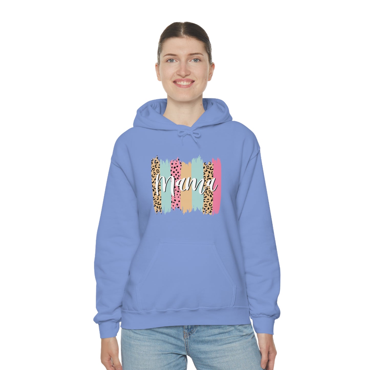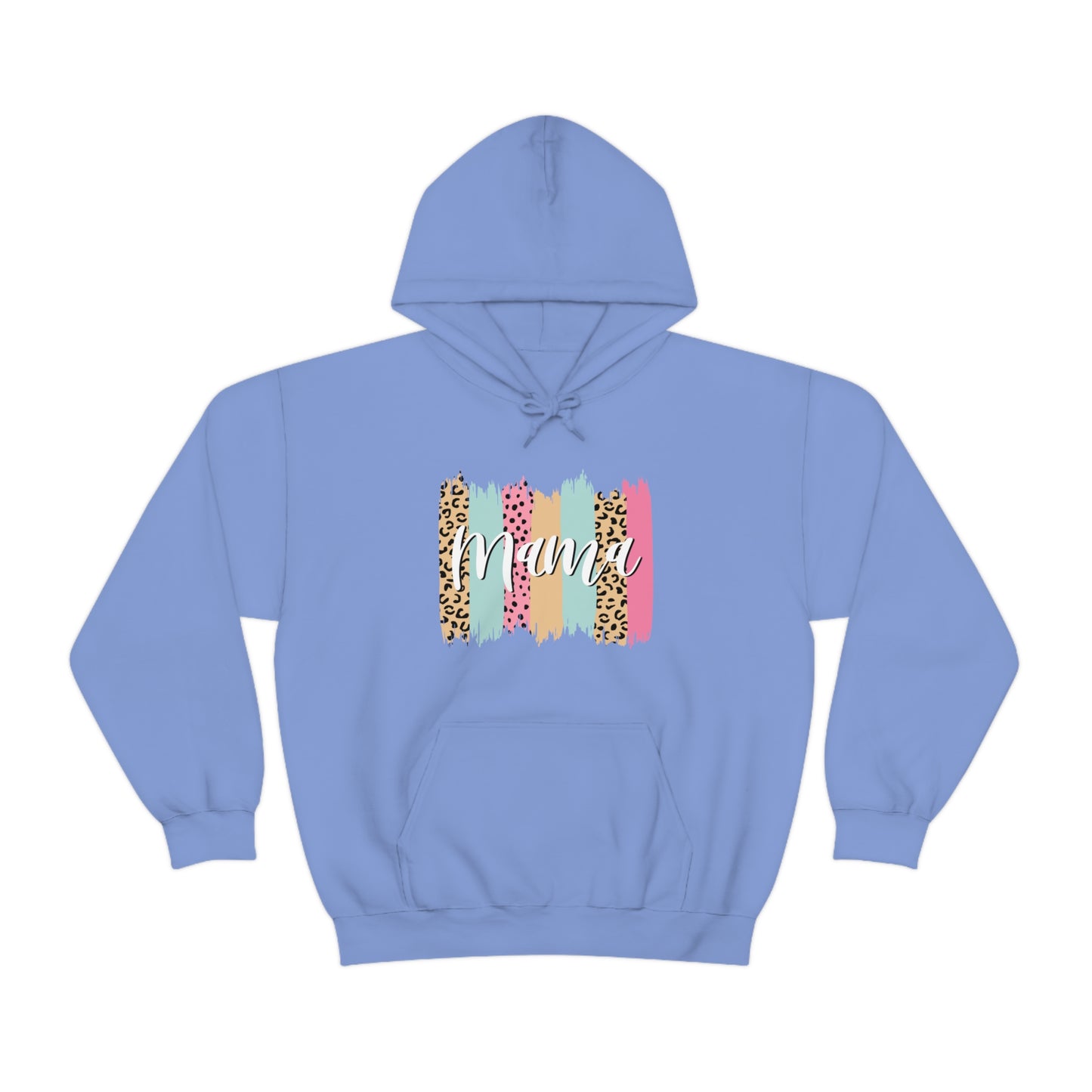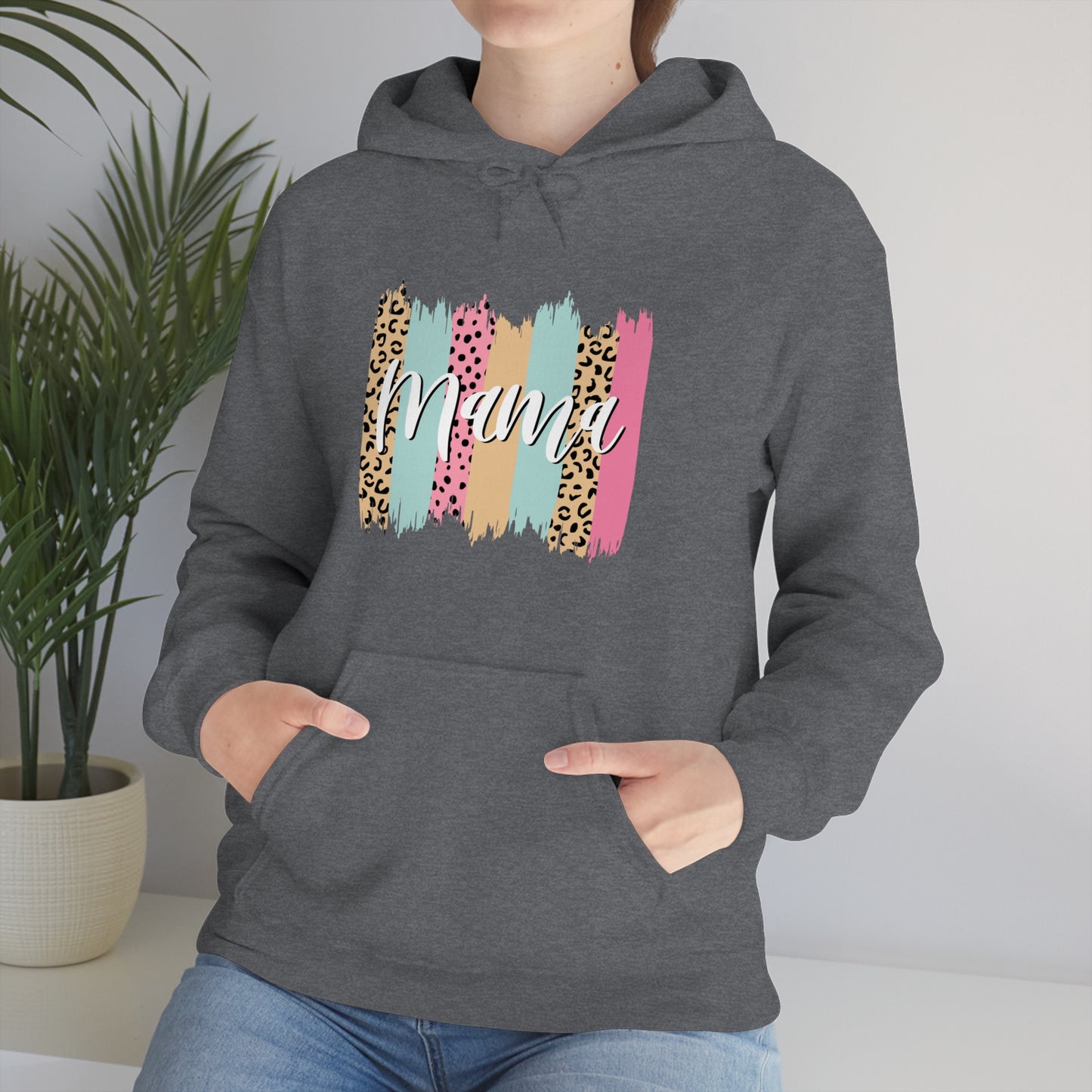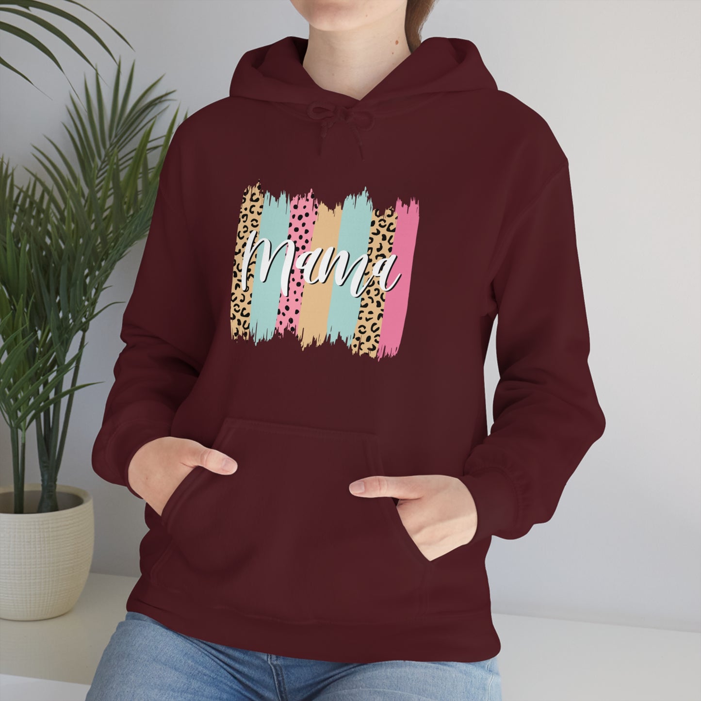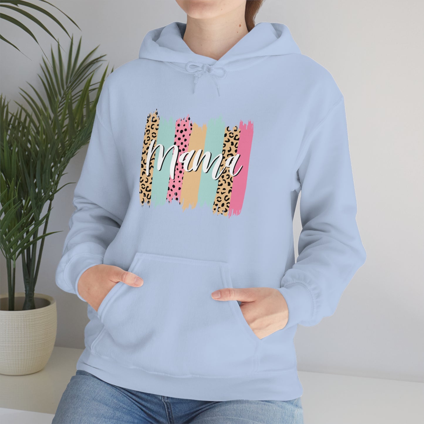 This unisex heavy blend hooded sweatshirt is relaxation itself. Made with a thick blend of cotton and polyester, it feels plush, soft and warm, a perfect choice for any cold day. In the front, the spacious kangaroo pocket adds daily practicality while the hood's drawstring is the same color as the base sweater for extra style points. Chill Stitch – Leopard Paint Strokes Mama - Unisex Hooded Hoodie Sweatshirt – Embrace Your Vibe