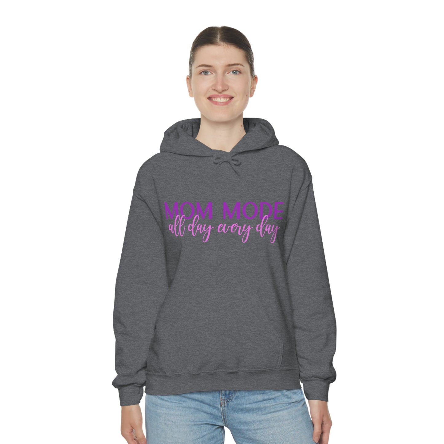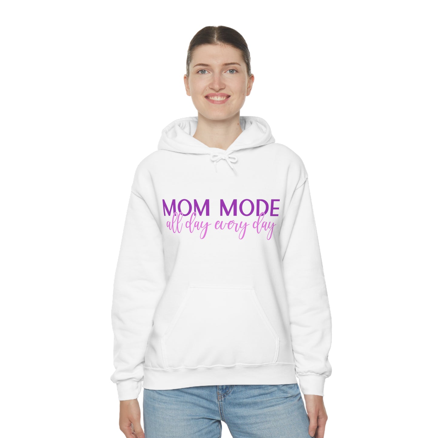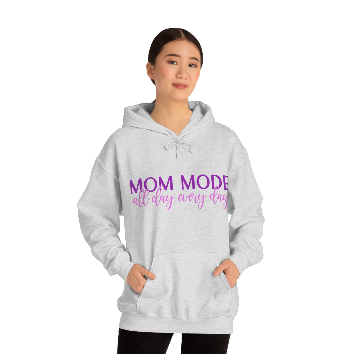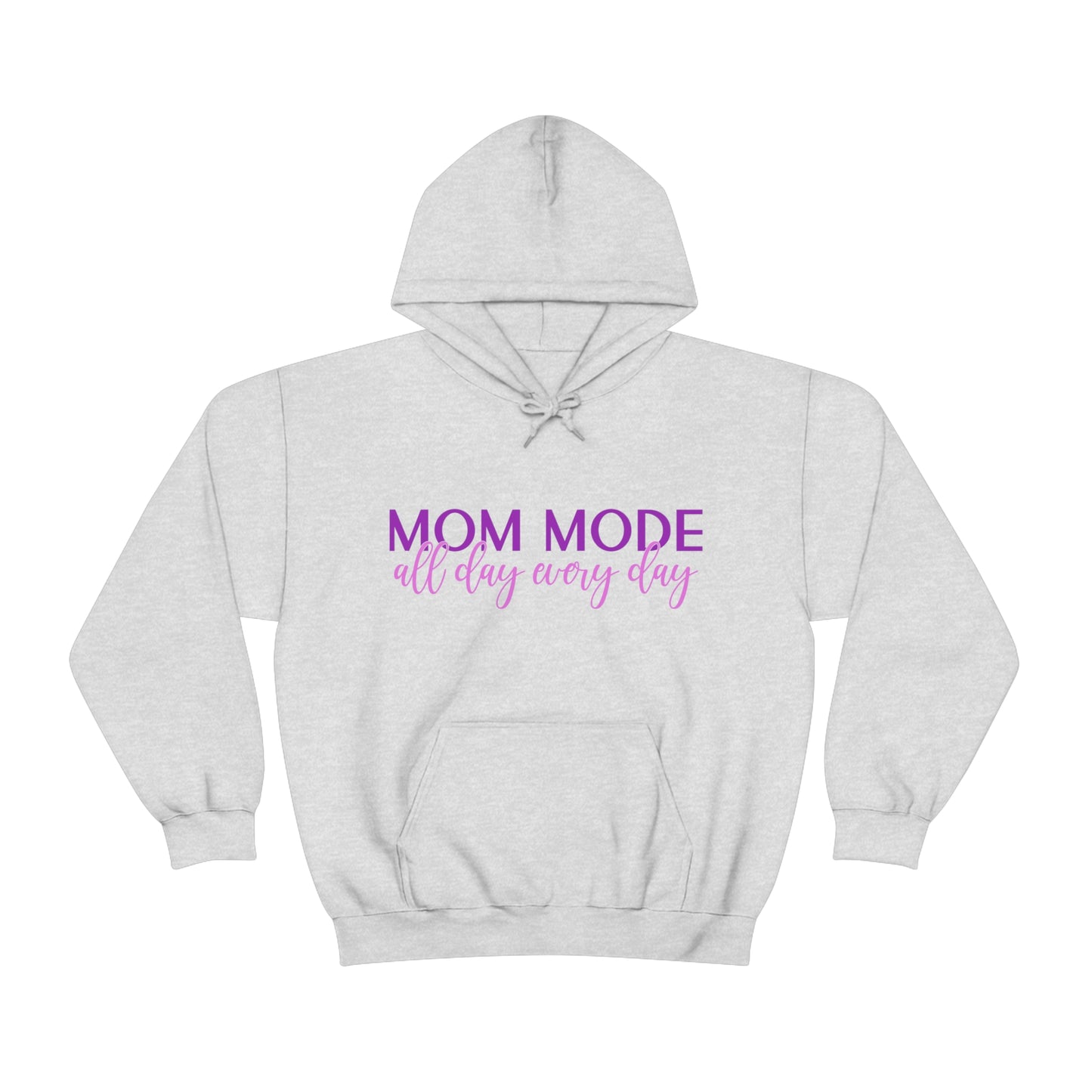 This unisex heavy blend hooded sweatshirt is relaxation itself. Made with a thick blend of cotton and polyester, it feels plush, soft and warm, a perfect choice for any cold day. In the front, the spacious kangaroo pocket adds daily practicality while the hood's drawstring is the same color as the base sweater for extra style points. Chill Stitch – Mom Mode All Day - Unisex Hooded Hoodie Sweatshirt – Embrace Your Vibe