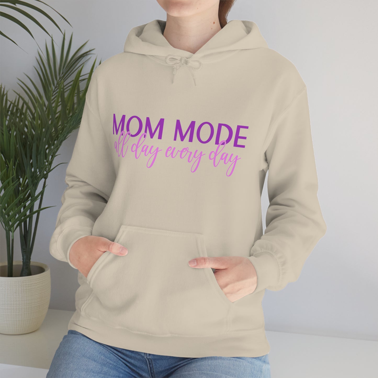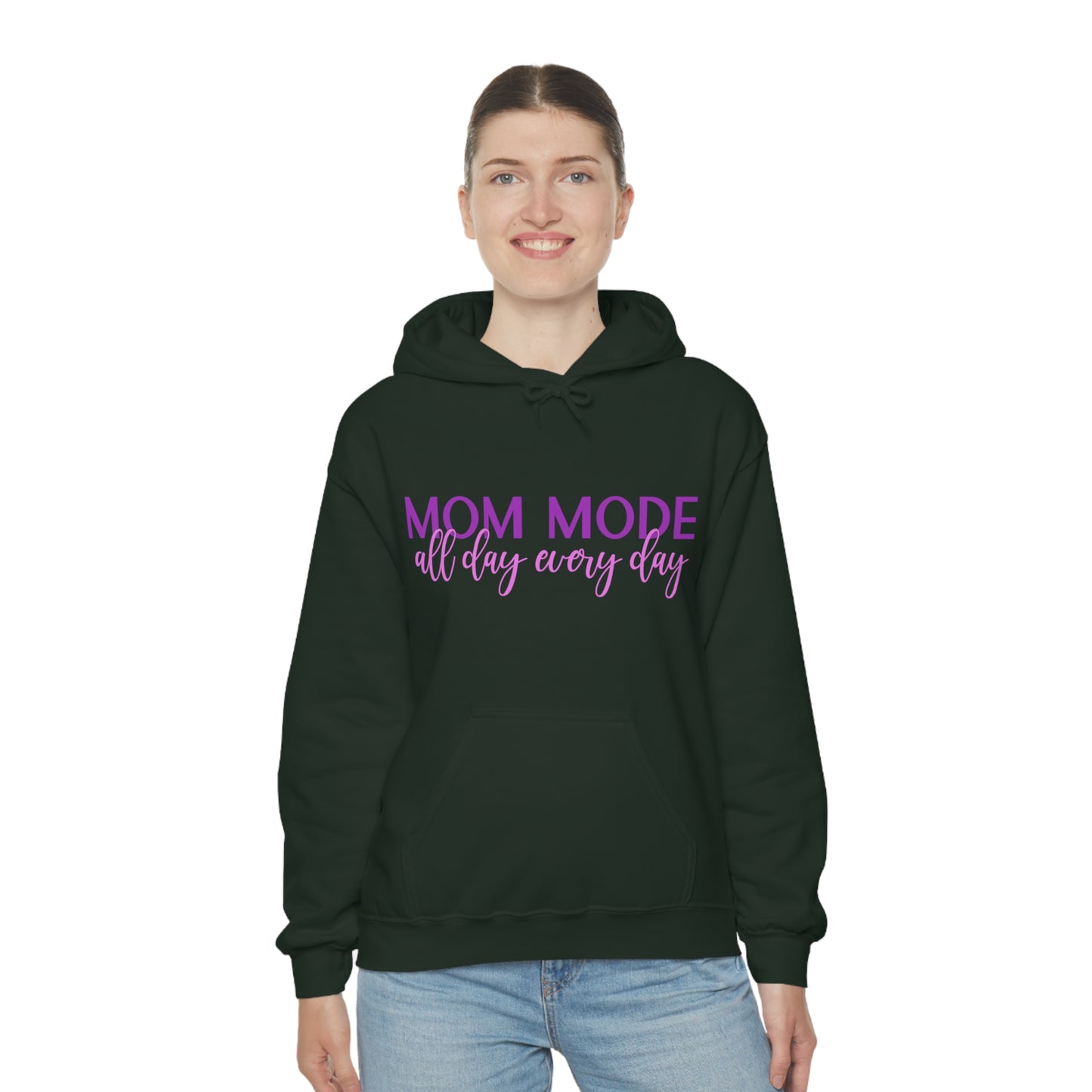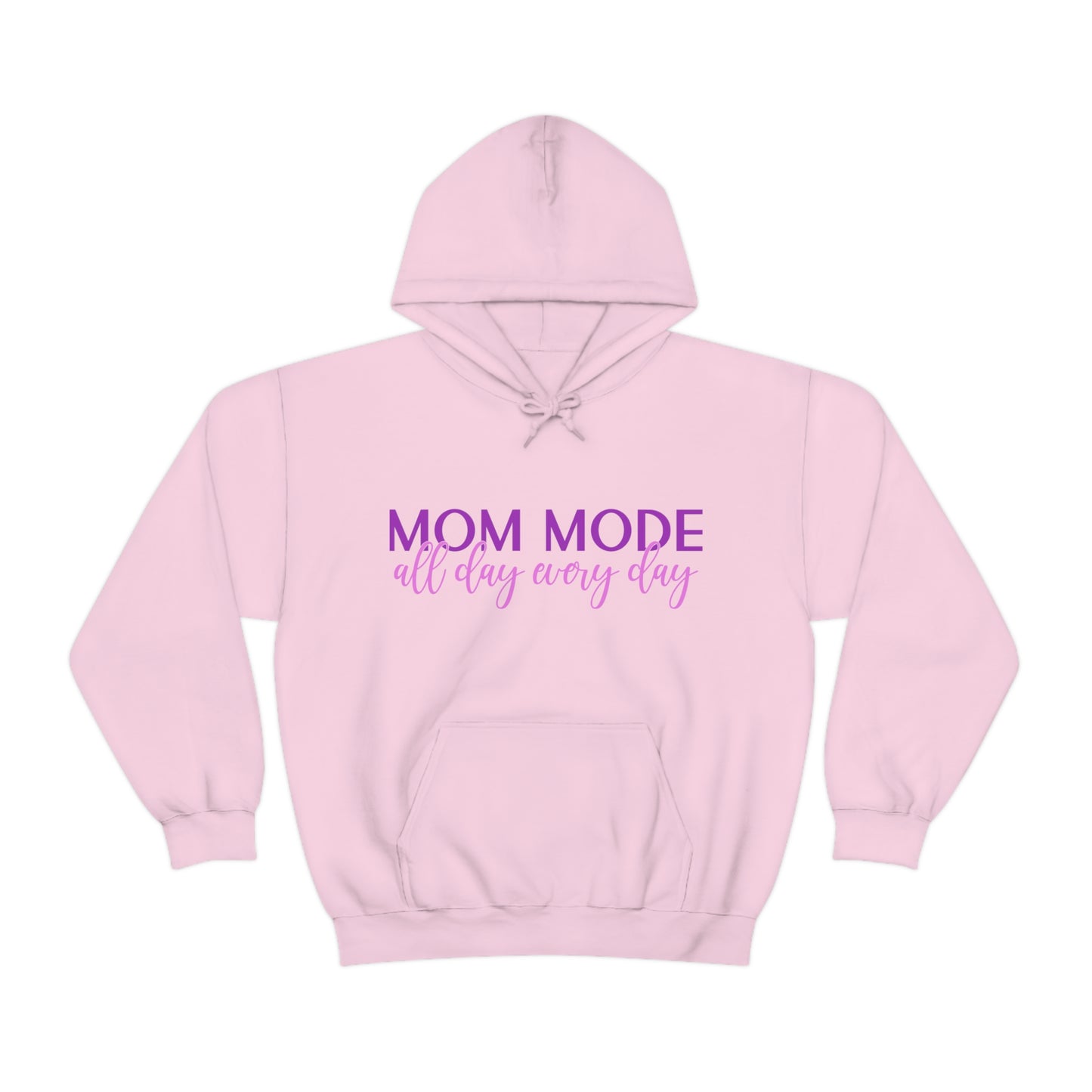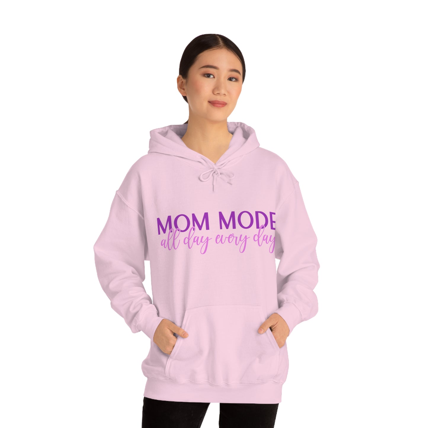 This unisex heavy blend hooded sweatshirt is relaxation itself. Made with a thick blend of cotton and polyester, it feels plush, soft and warm, a perfect choice for any cold day. In the front, the spacious kangaroo pocket adds daily practicality while the hood's drawstring is the same color as the base sweater for extra style points. Chill Stitch – Mom Mode All Day - Unisex Hooded Hoodie Sweatshirt – Embrace Your Vibe