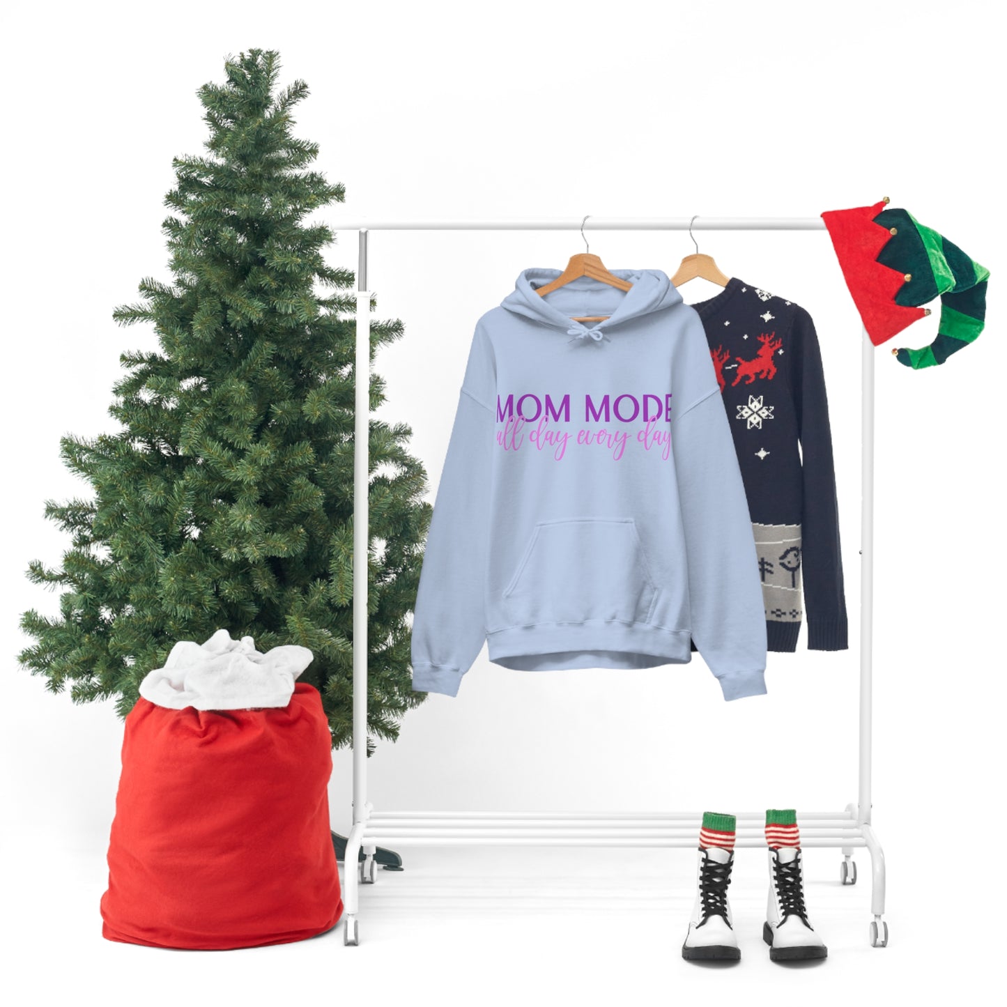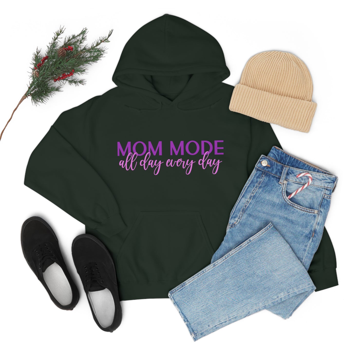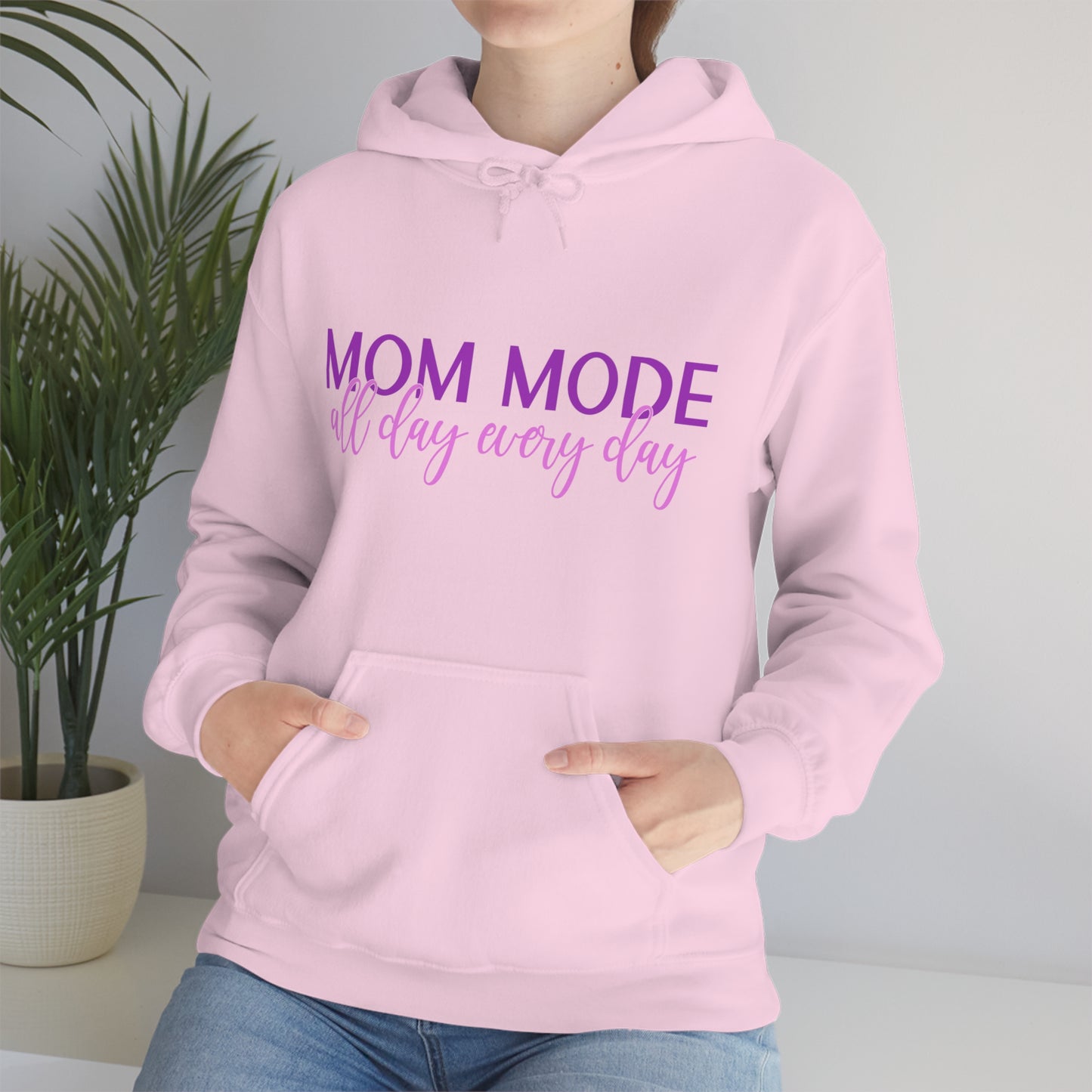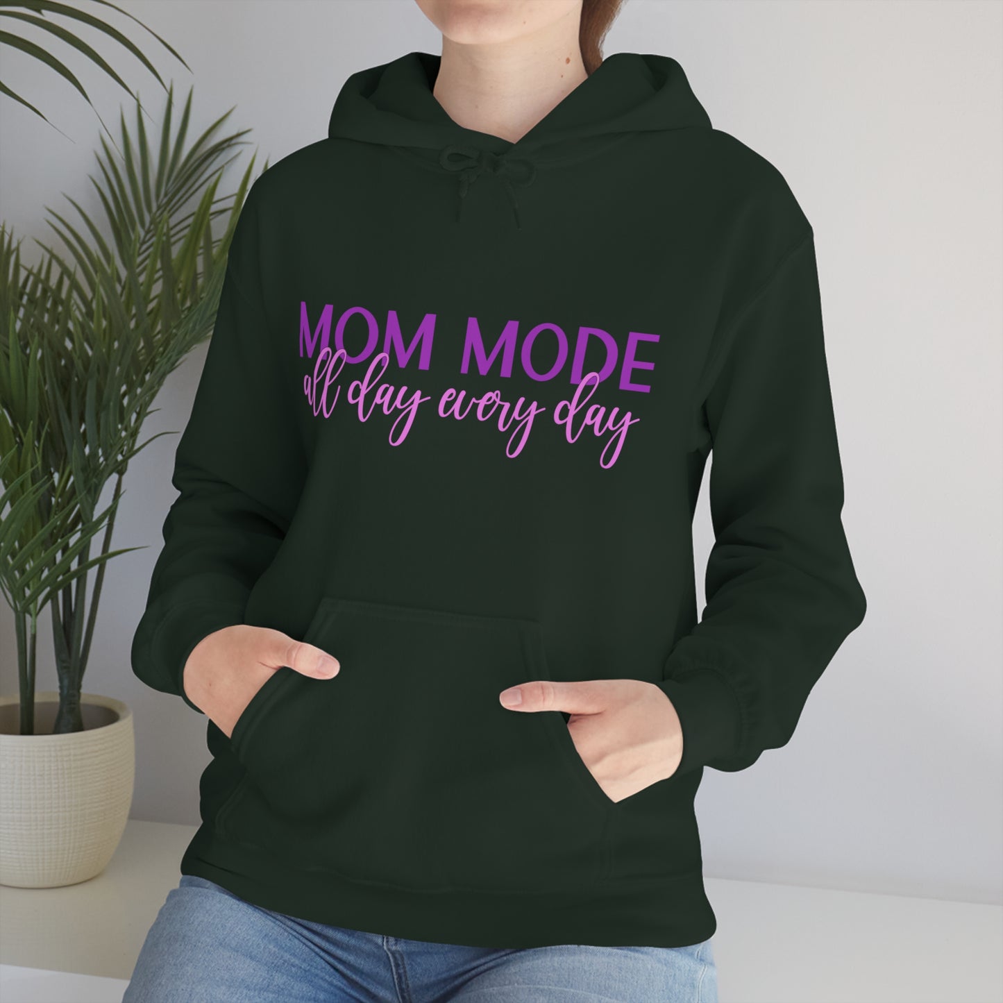 This unisex heavy blend hooded sweatshirt is relaxation itself. Made with a thick blend of cotton and polyester, it feels plush, soft and warm, a perfect choice for any cold day. In the front, the spacious kangaroo pocket adds daily practicality while the hood's drawstring is the same color as the base sweater for extra style points. Chill Stitch – Mom Mode All Day - Unisex Hooded Hoodie Sweatshirt – Embrace Your Vibe