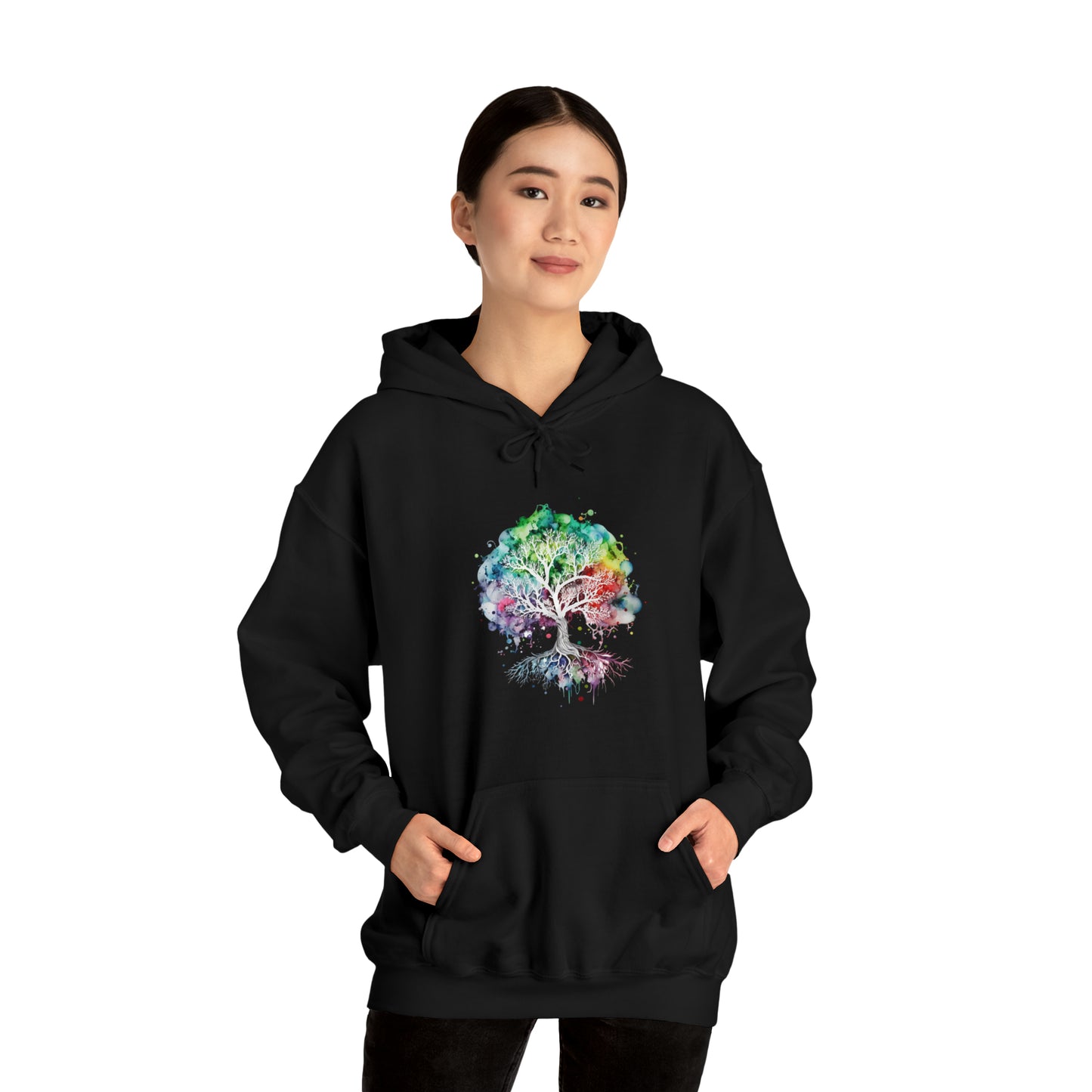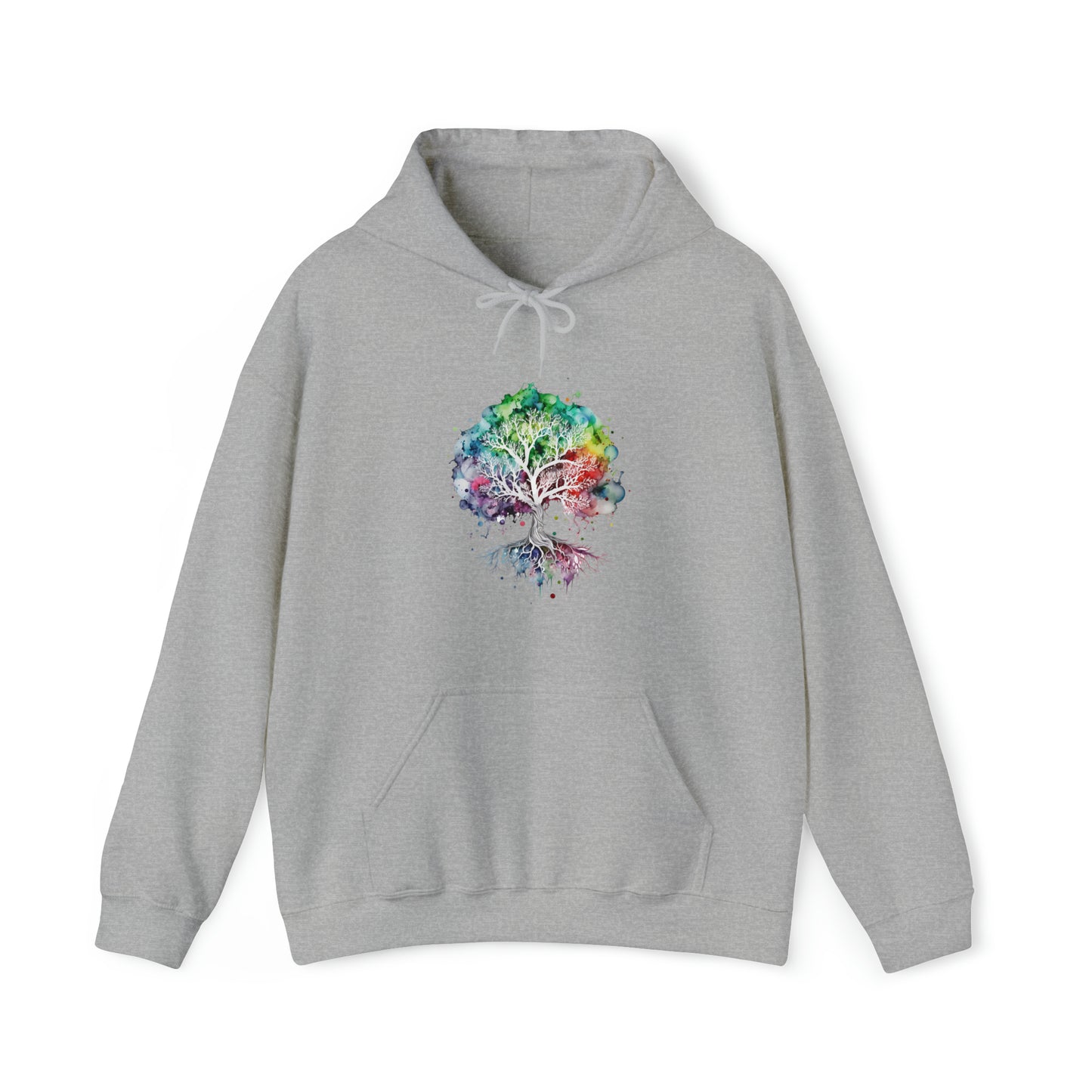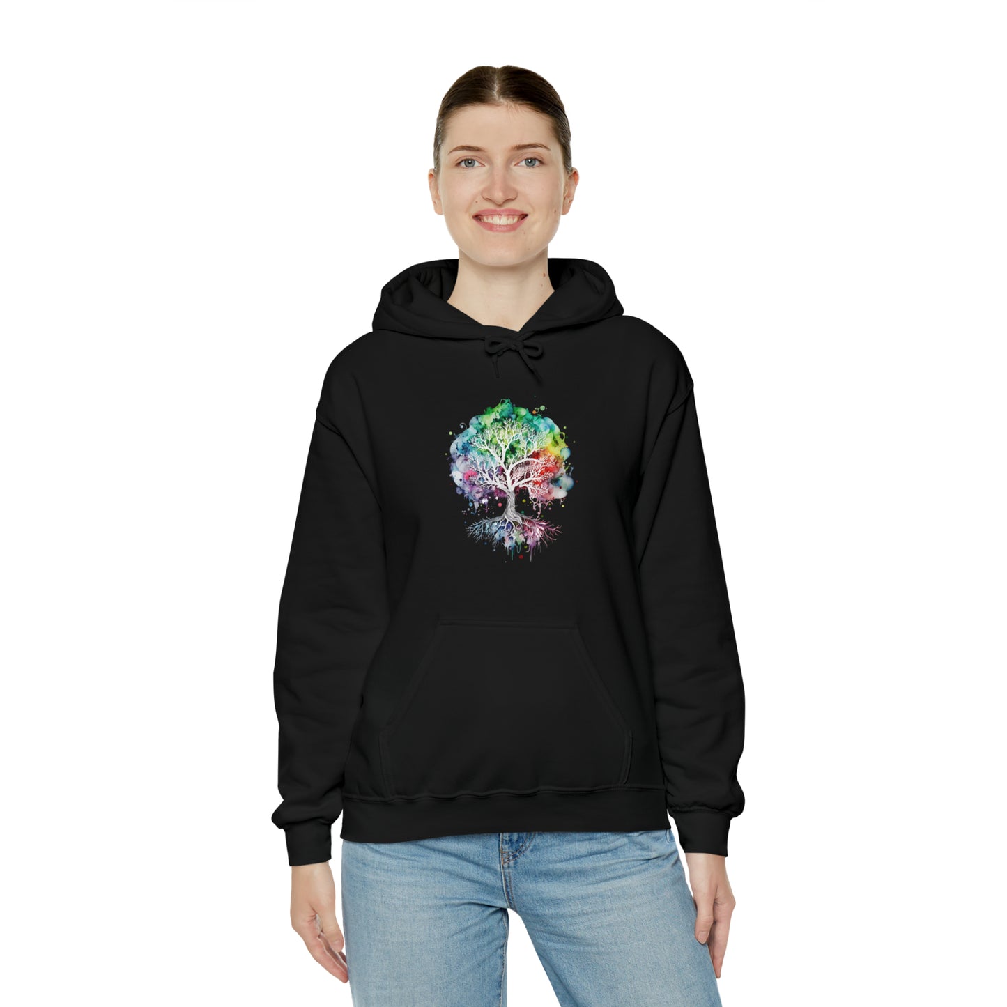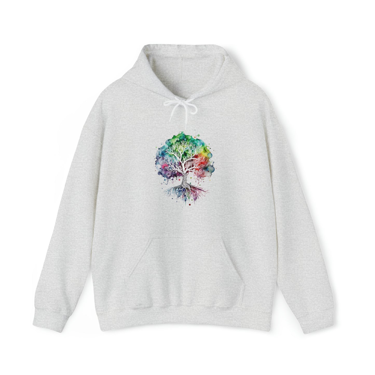 This unisex heavy blend hooded sweatshirt is relaxation itself. Made with a thick blend of cotton and polyester, it feels plush, soft and warm, a perfect choice for any cold day. In the front, the spacious kangaroo pocket adds daily practicality while the hood's drawstring is the same color as the base sweater for extra style points. Chill Stitch – Tree of Life Watercolor V4 Color Burst - Unisex Hooded Hoodie Sweatshirt – Embrace Your Vibe