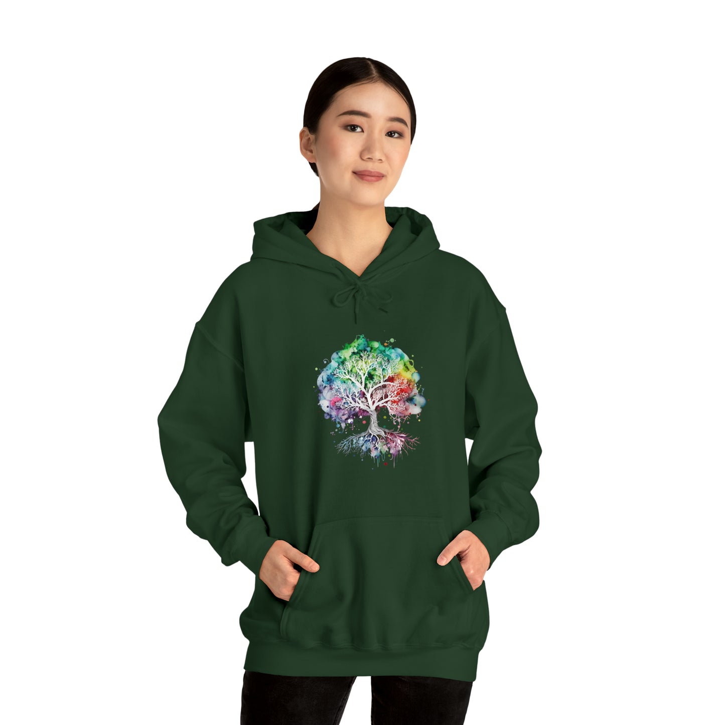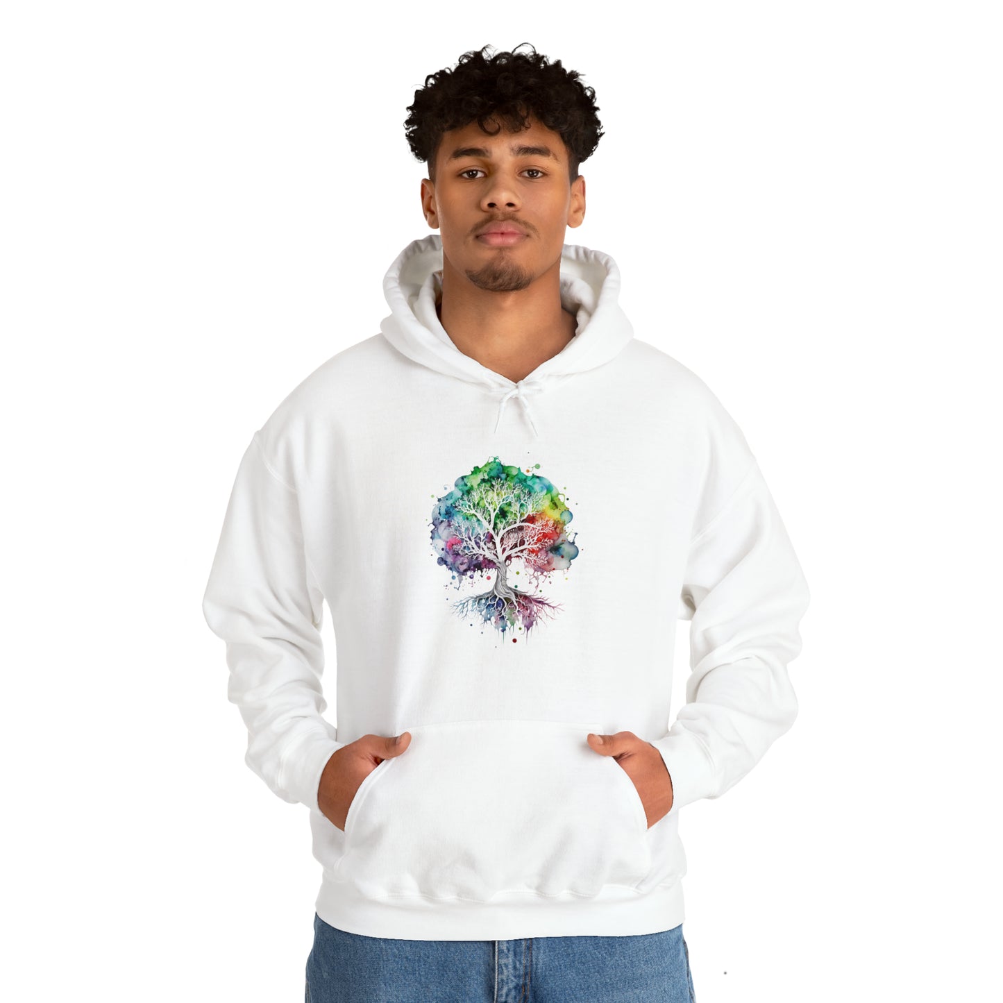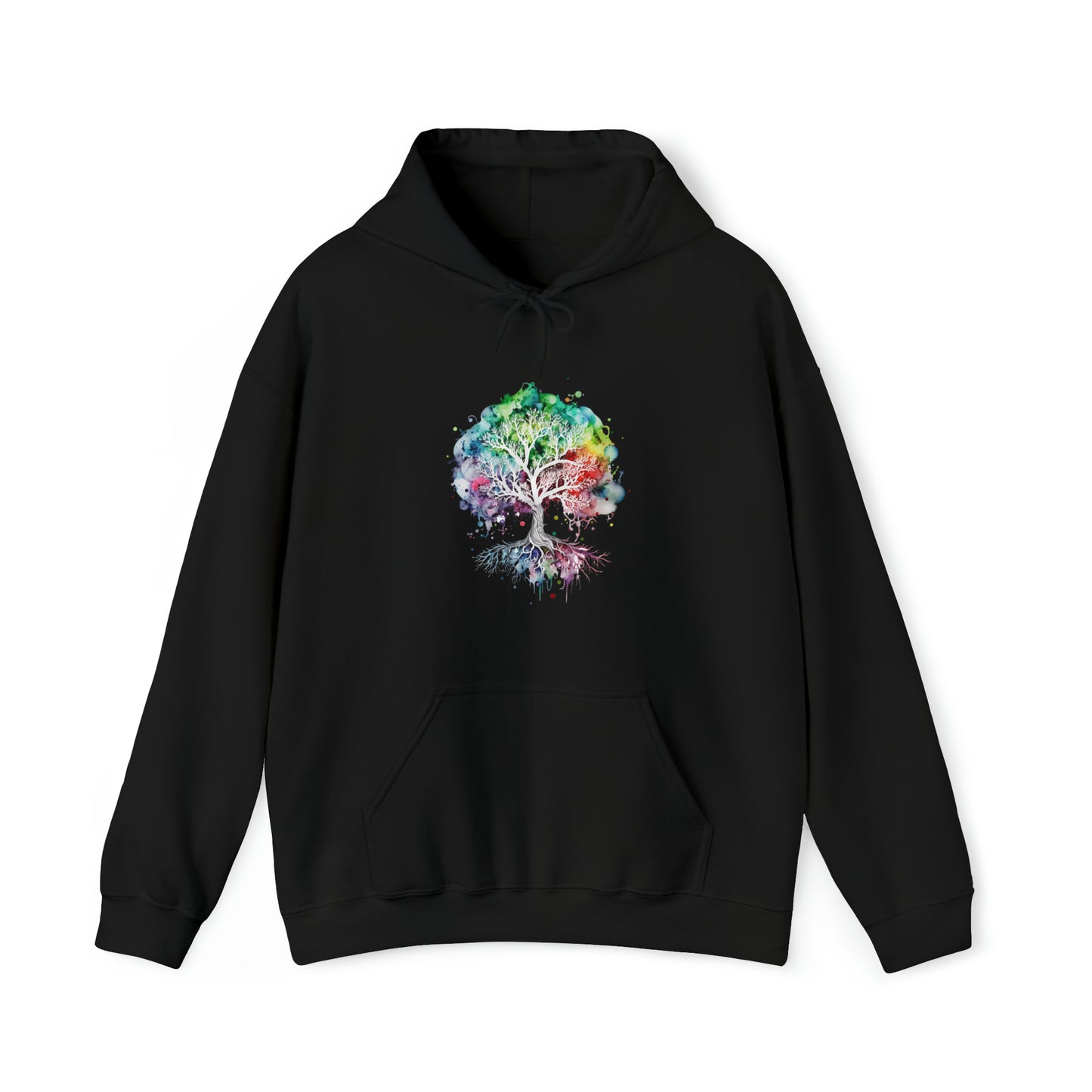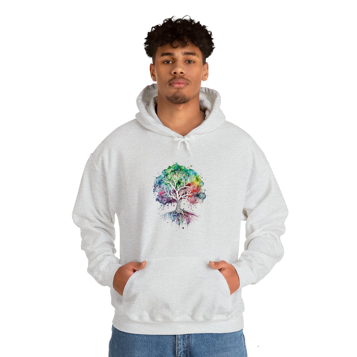 This unisex heavy blend hooded sweatshirt is relaxation itself. Made with a thick blend of cotton and polyester, it feels plush, soft and warm, a perfect choice for any cold day. In the front, the spacious kangaroo pocket adds daily practicality while the hood's drawstring is the same color as the base sweater for extra style points. Chill Stitch – Tree of Life Watercolor V4 Color Burst - Unisex Hooded Hoodie Sweatshirt – Embrace Your Vibe