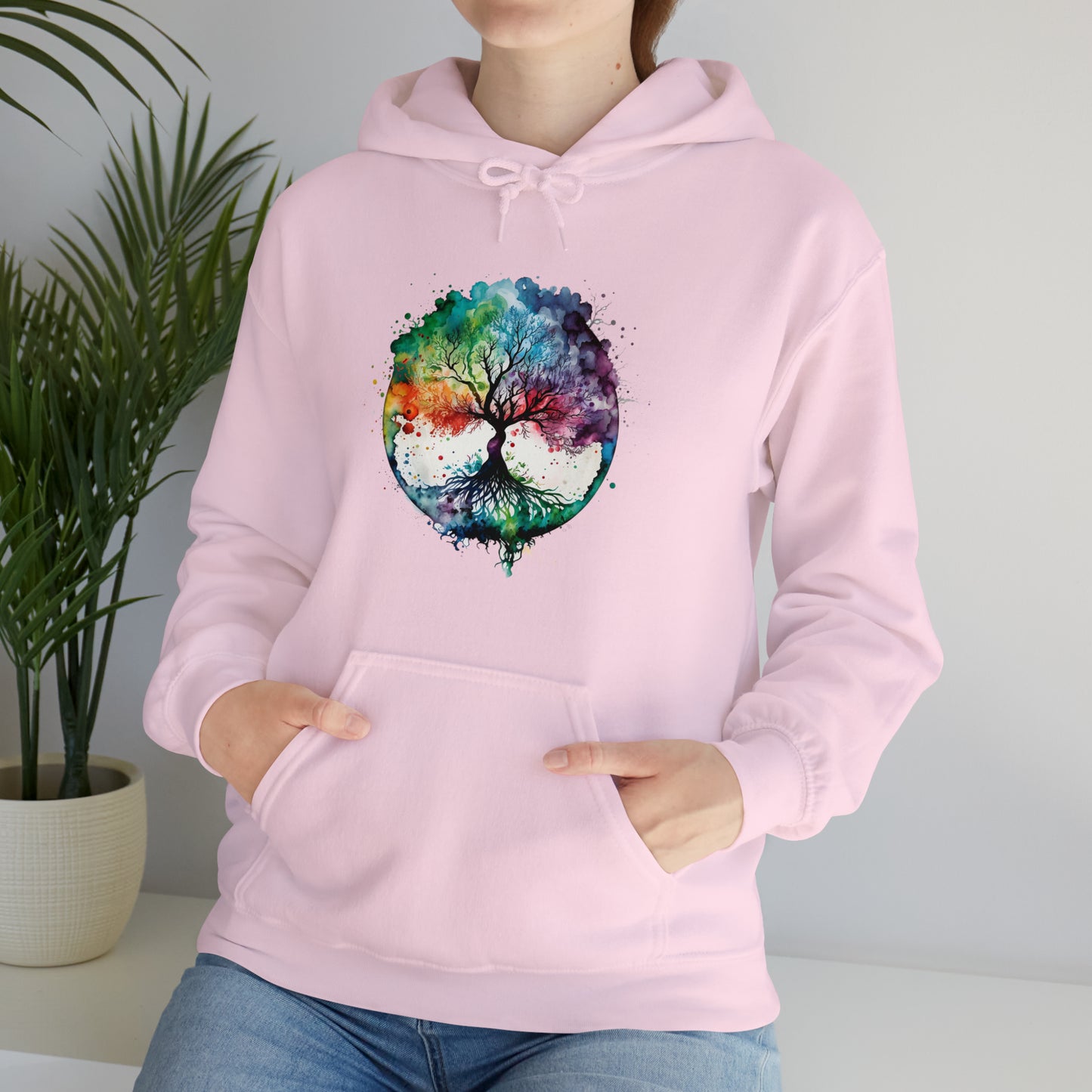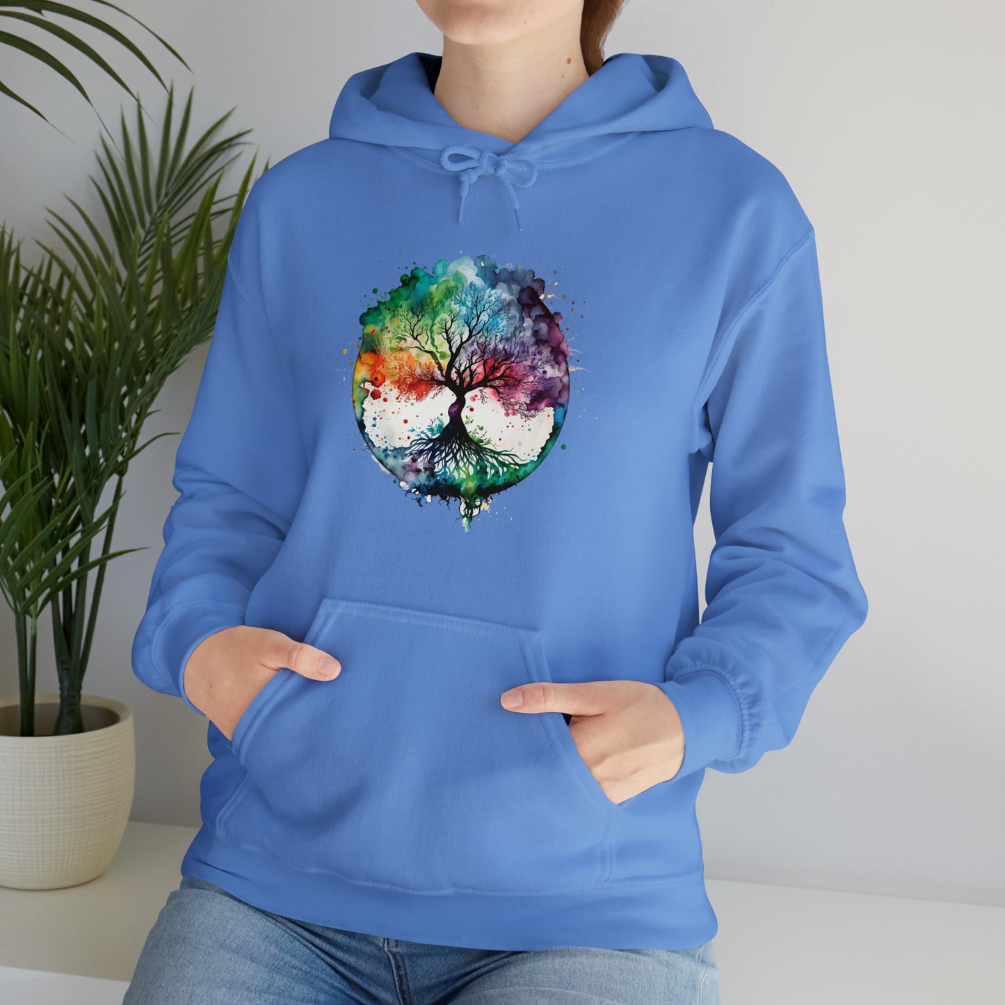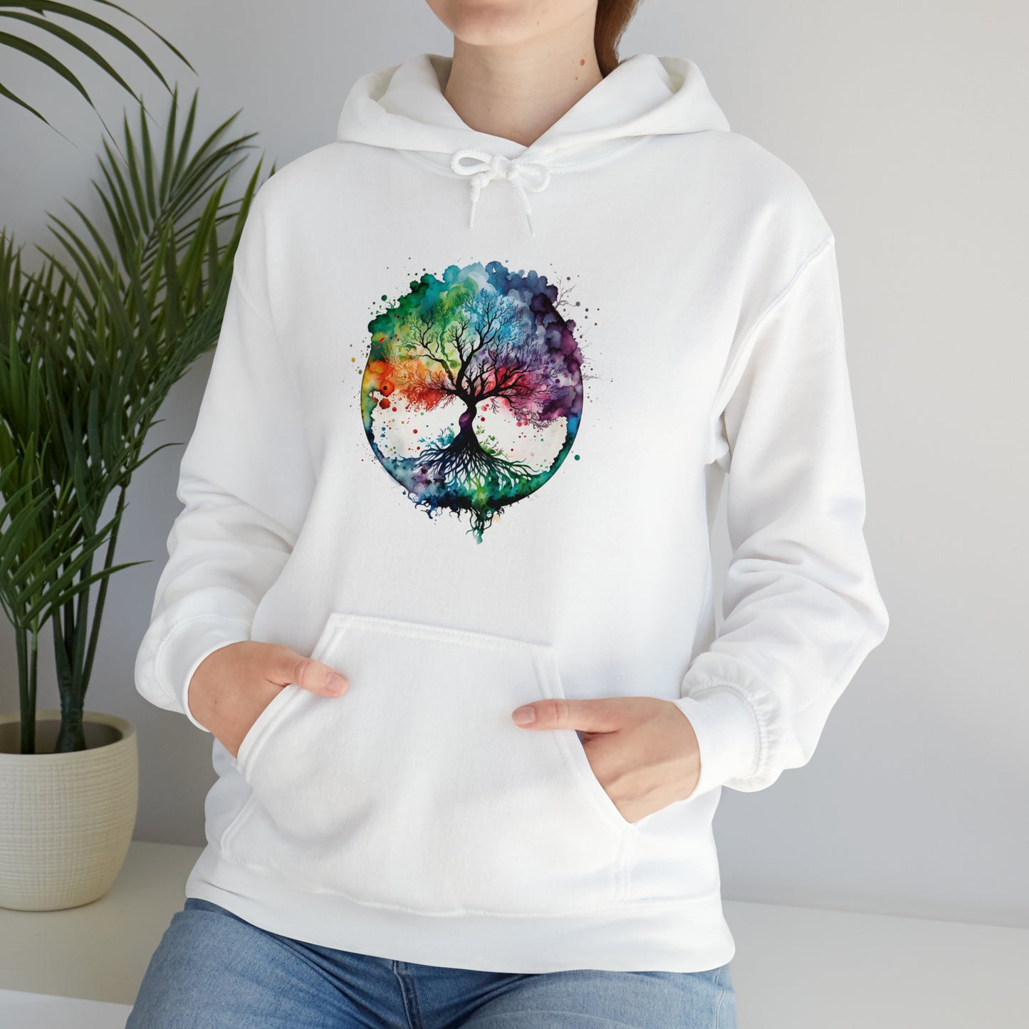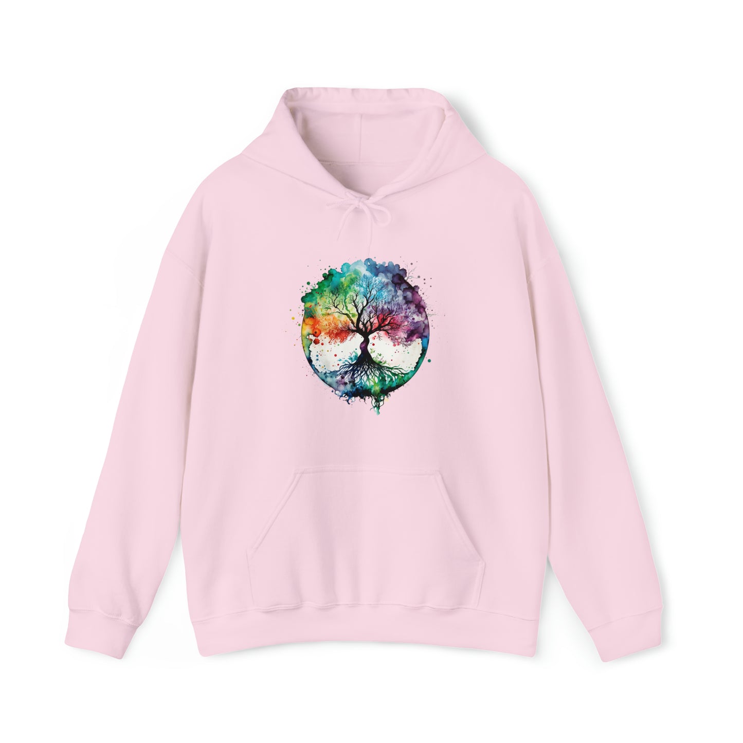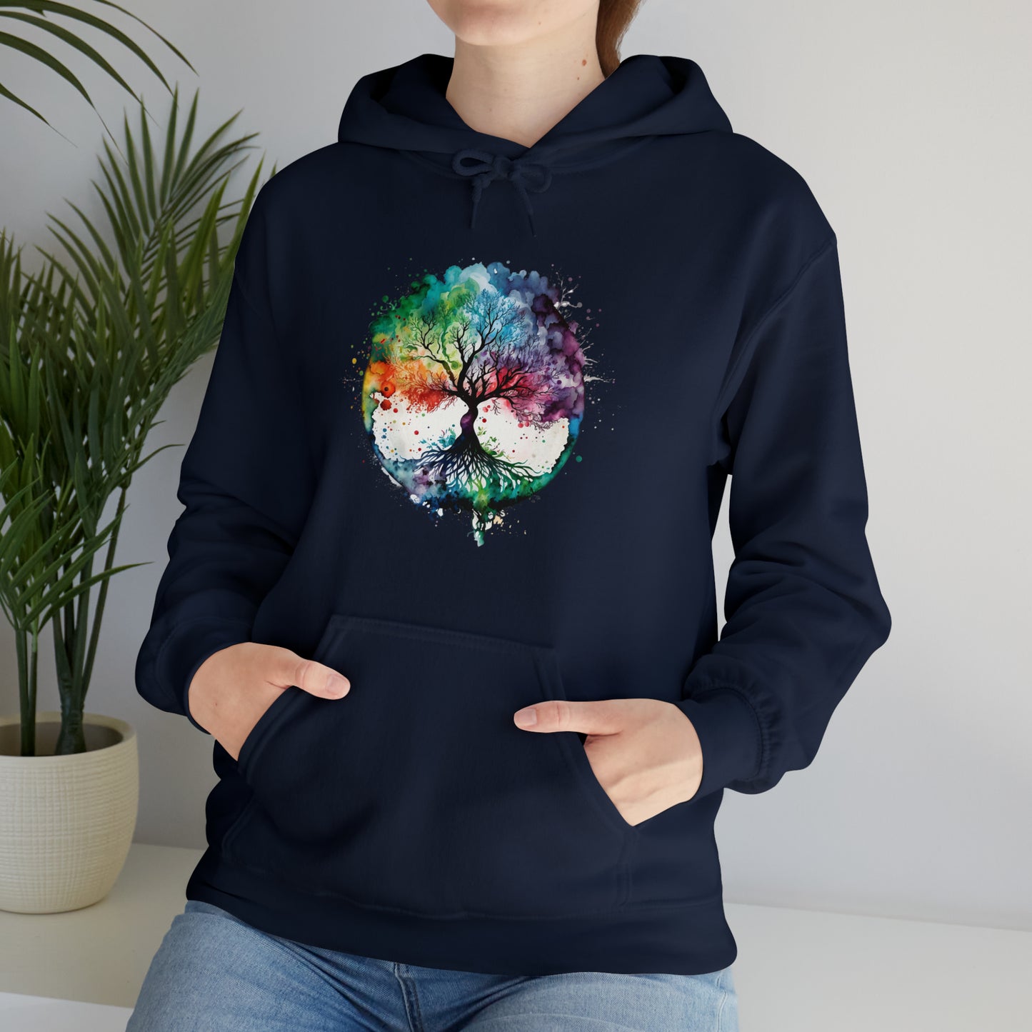 This unisex heavy blend hooded sweatshirt is relaxation itself. Made with a thick blend of cotton and polyester, it feels plush, soft and warm, a perfect choice for any cold day. In the front, the spacious kangaroo pocket adds daily practicality while the hood's drawstring is the same color as the base sweater for extra style points. Chill Stitch – Tree of Life Watercolor V1 Color Flow - Unisex Hooded Hoodie Sweatshirt – Embrace Your Vibe