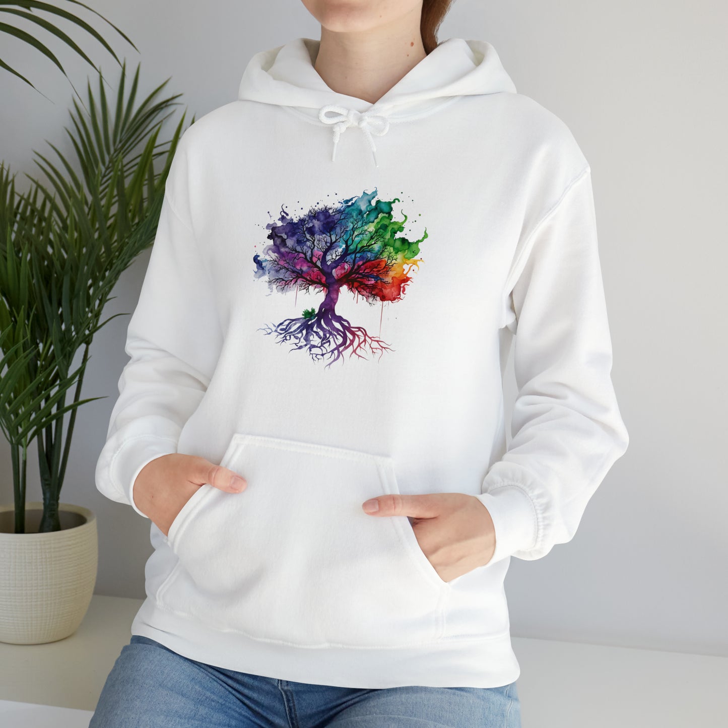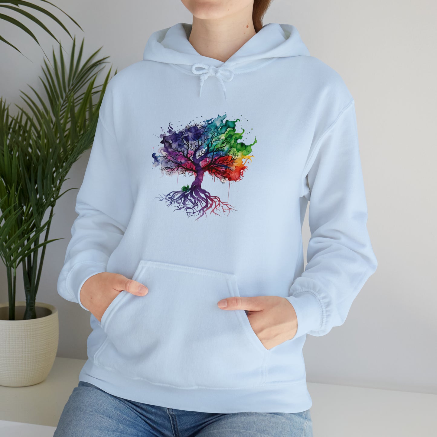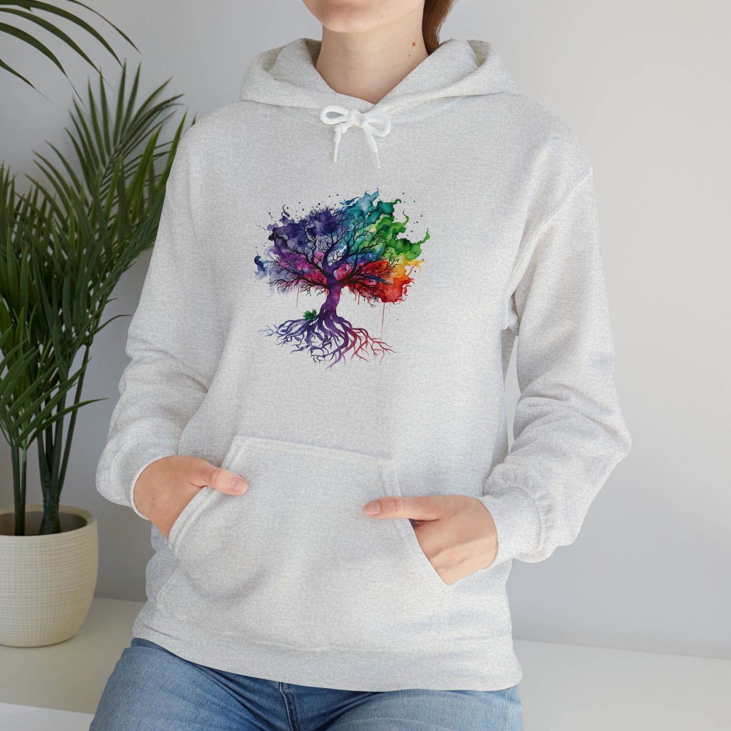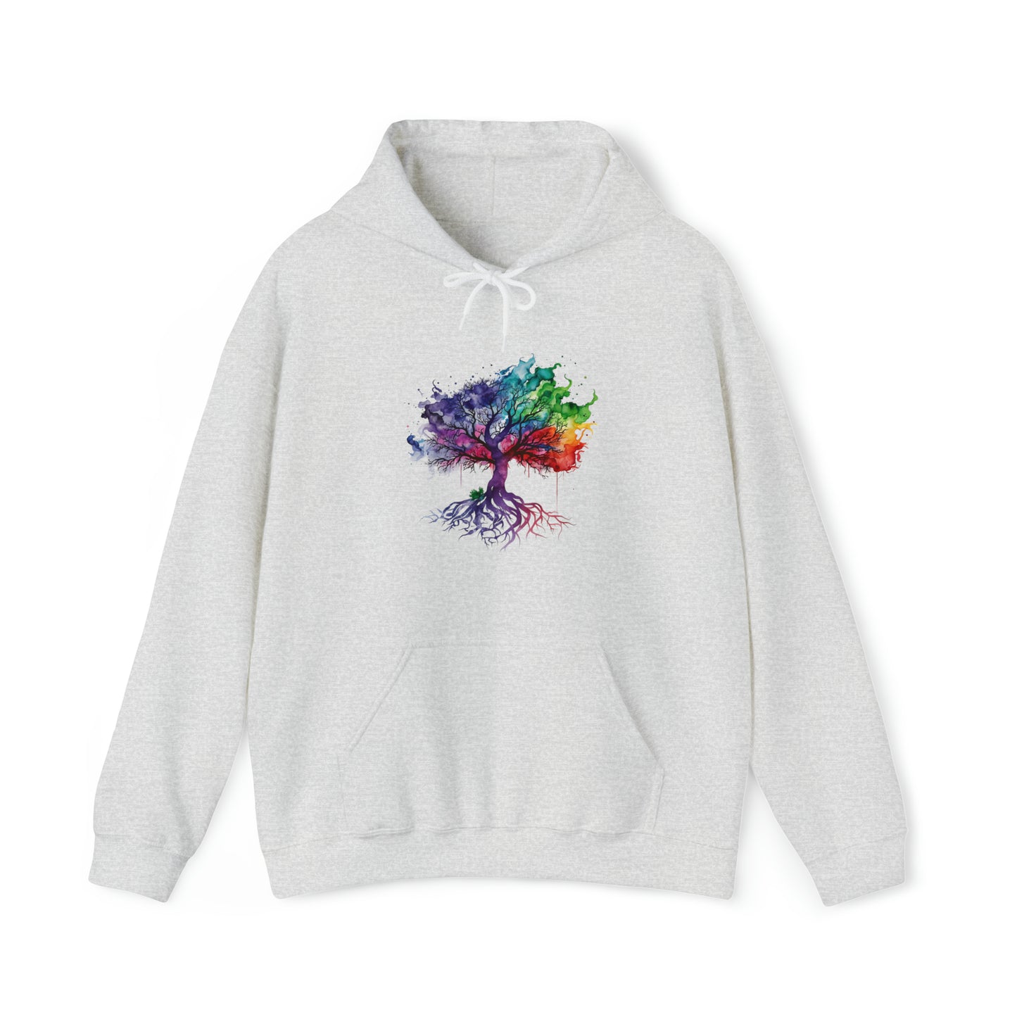 This unisex heavy blend hooded sweatshirt is relaxation itself. Made with a thick blend of cotton and polyester, it feels plush, soft and warm, a perfect choice for any cold day. In the front, the spacious kangaroo pocket adds daily practicality while the hood's drawstring is the same color as the base sweater for extra style points. Chill Stitch – Tree of Life Watercolor Flowing Color V2 - Unisex Hooded Hoodie Sweatshirt – Embrace Your Vibe